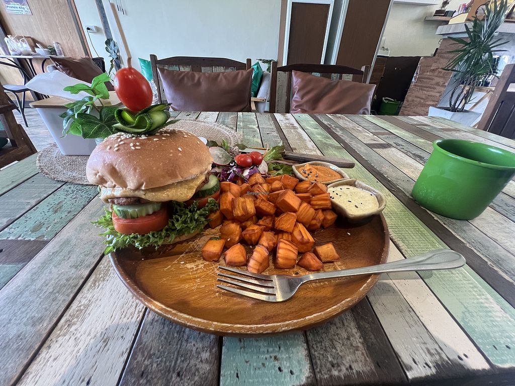 Mushroom bean burger with home made fake cheese sauce and sweet potato…