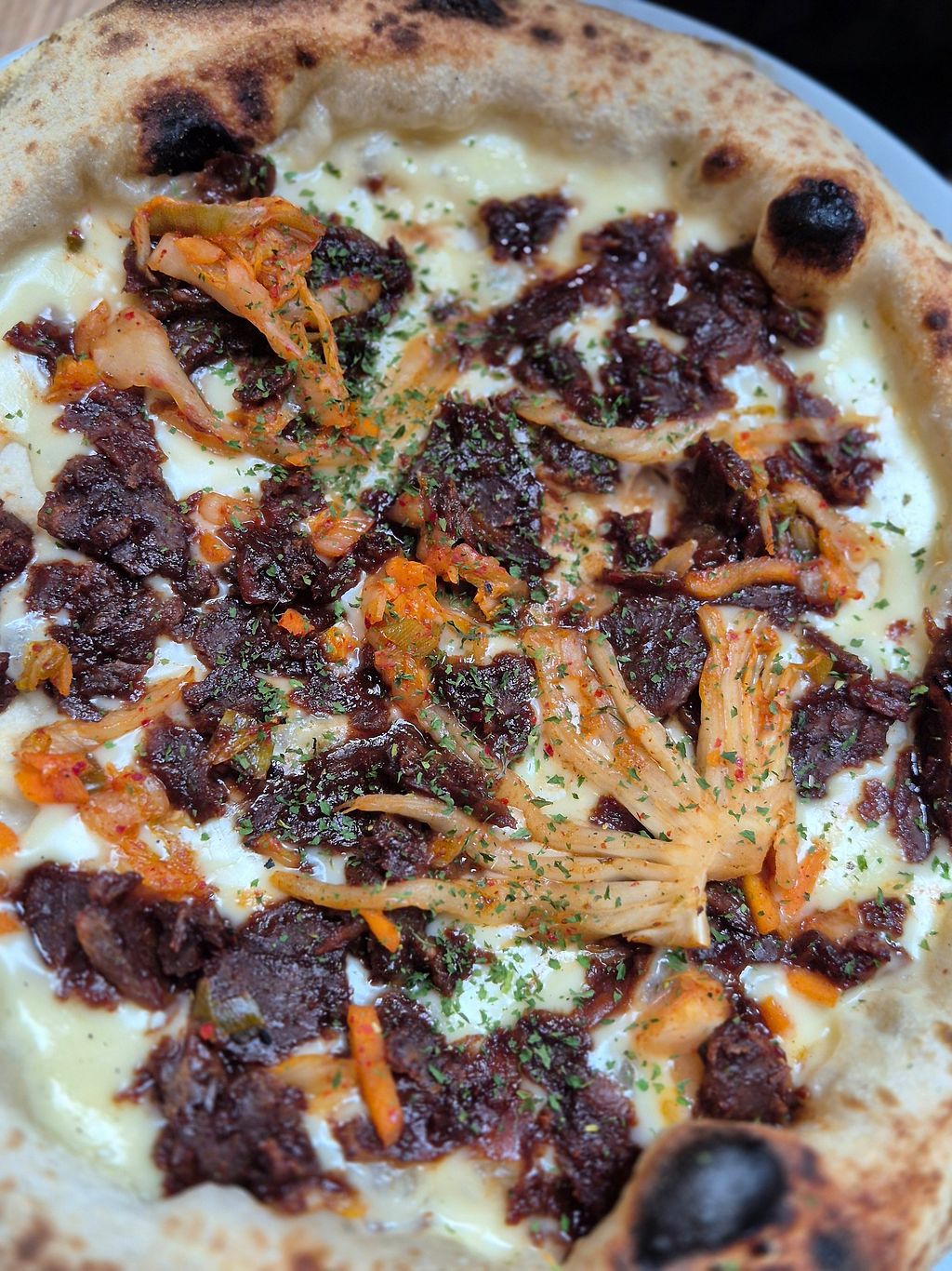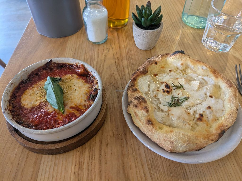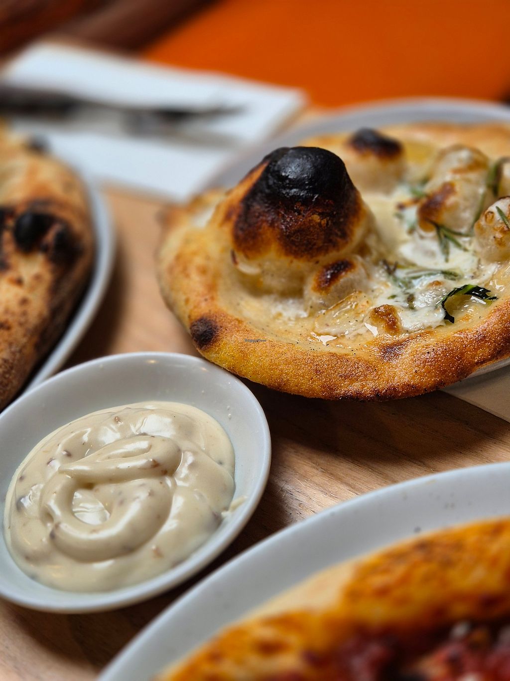 Margherita pizza, pistachio cream pizza, meatballs and Mac and cheese.