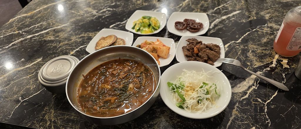 Delicious vegan Korean food off the beaten path. The owner is lovely and friendly. Menu in Korean only. Enjoyed the vegan chicken so much I forgot to take a photo! Also had the set menu with yukgaejang soup. It was excellent! Close to Namsanjeong St Exit 1.