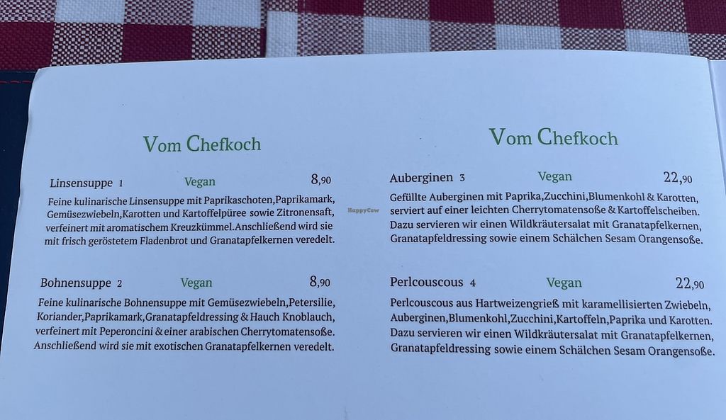 Read moreDas Restaurant ist sicherlich gehobenes Niveau, sowohl die Einrichtung und der Service. Dennoch fand ich es für die Preise dann nicht gut genug bzw. die Portionen etwas zu klein. Der libanesische Rotwein kostete 8,90 für 0,2 l. Er war gut, aber ich habe schon günstigere Rotweine getrunken, die besser waren. Bei den Hauptspeisen gibt es nur ein veganes Gericht, Couscous mit Gemüse. Fazit: Gut, schönes Ambiente, aber kein Stammrestaurantfaktor.