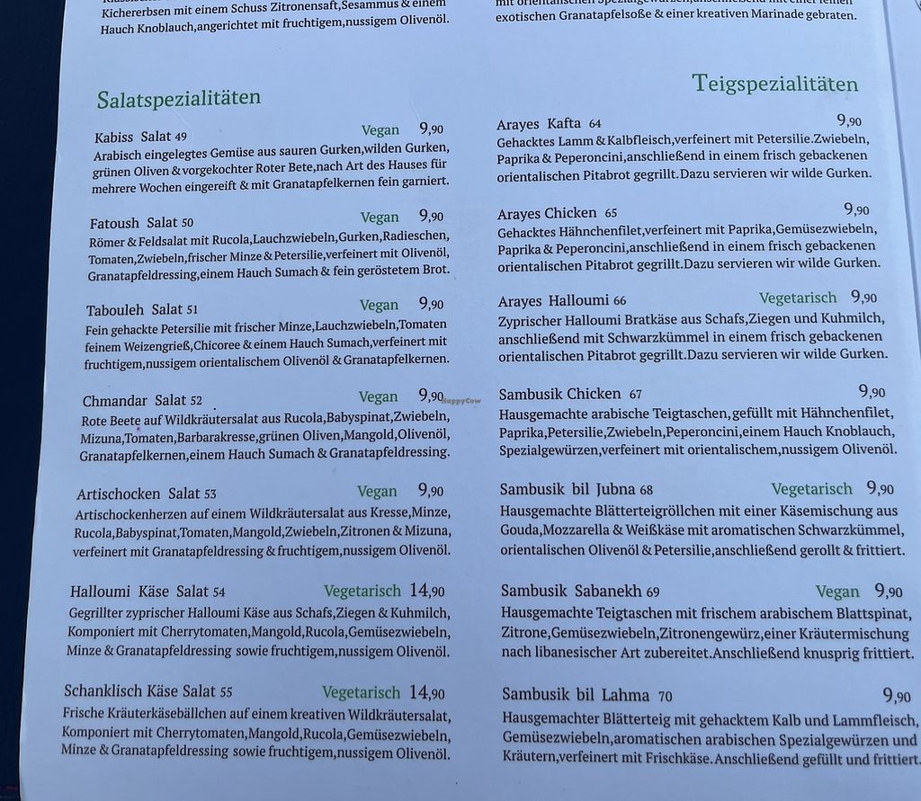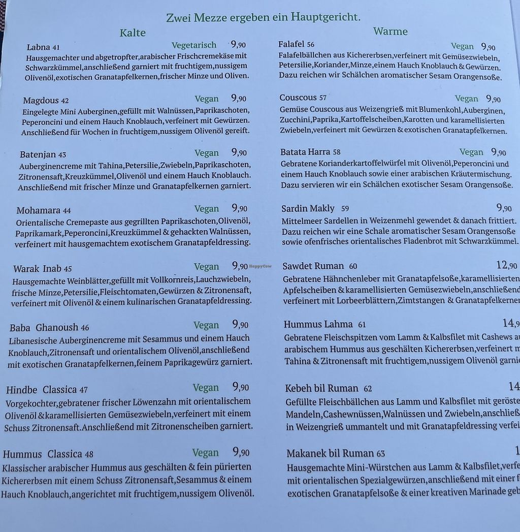 Pros: Viele vegane Vorspeisen (Mezze), vegane, und vegetarische Gerichte klar markiert auf der, Karte