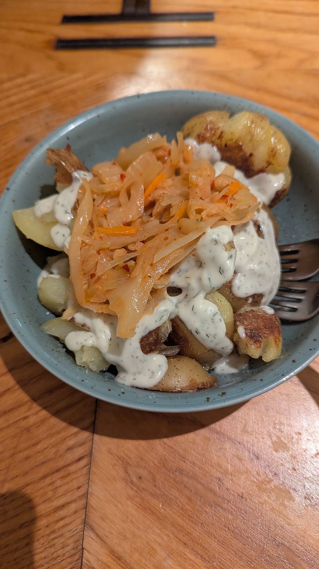 Kimchi patatas bravas. An interesting take on bravas, instead of a single smooth spicy sauce, these had mild vegan mayo and crunchy, spicy kimchi, which gave a fun contrast in textures along with the potatoes, of course. They weren't blended, so I enjoyed trying one potato with just mayo, one with just kimchi, and others with varying ratios. Portion was huge, twice as much as I expected.