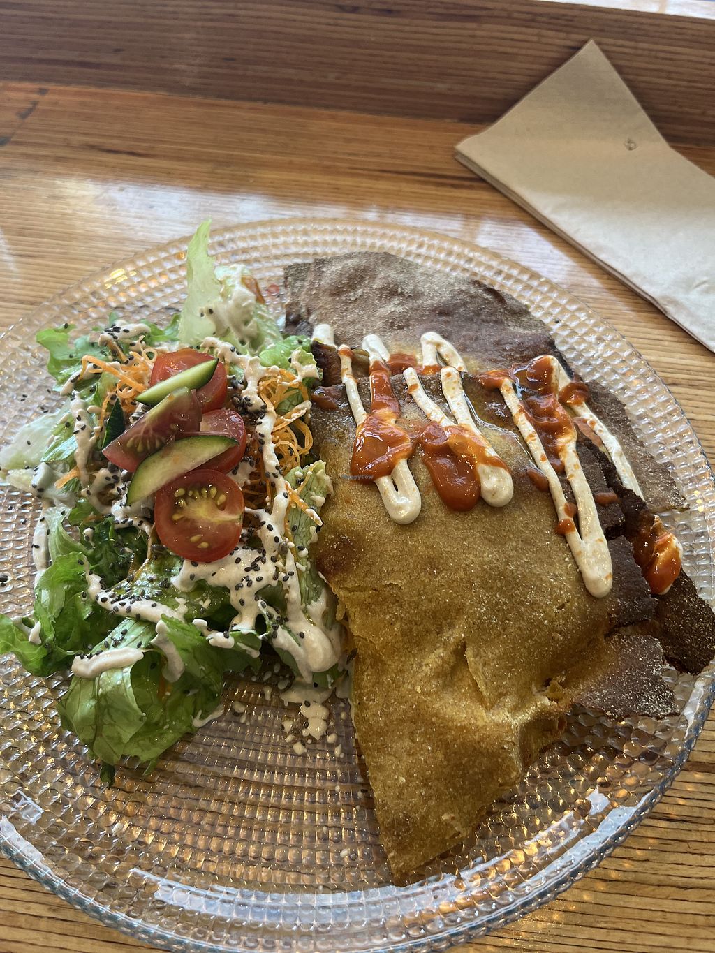 This cafe offers a lot of raw food and also hot food, plenty of gluten free options too. I ordered the dish of the day which was chickpea pancakes with pulled mushrooms and roasted veggies and salad. It was all well seasoned, the pancakes had dollops of delicious cashew cheese and pesto. I also ordered the pizza slice which was very tasty too.