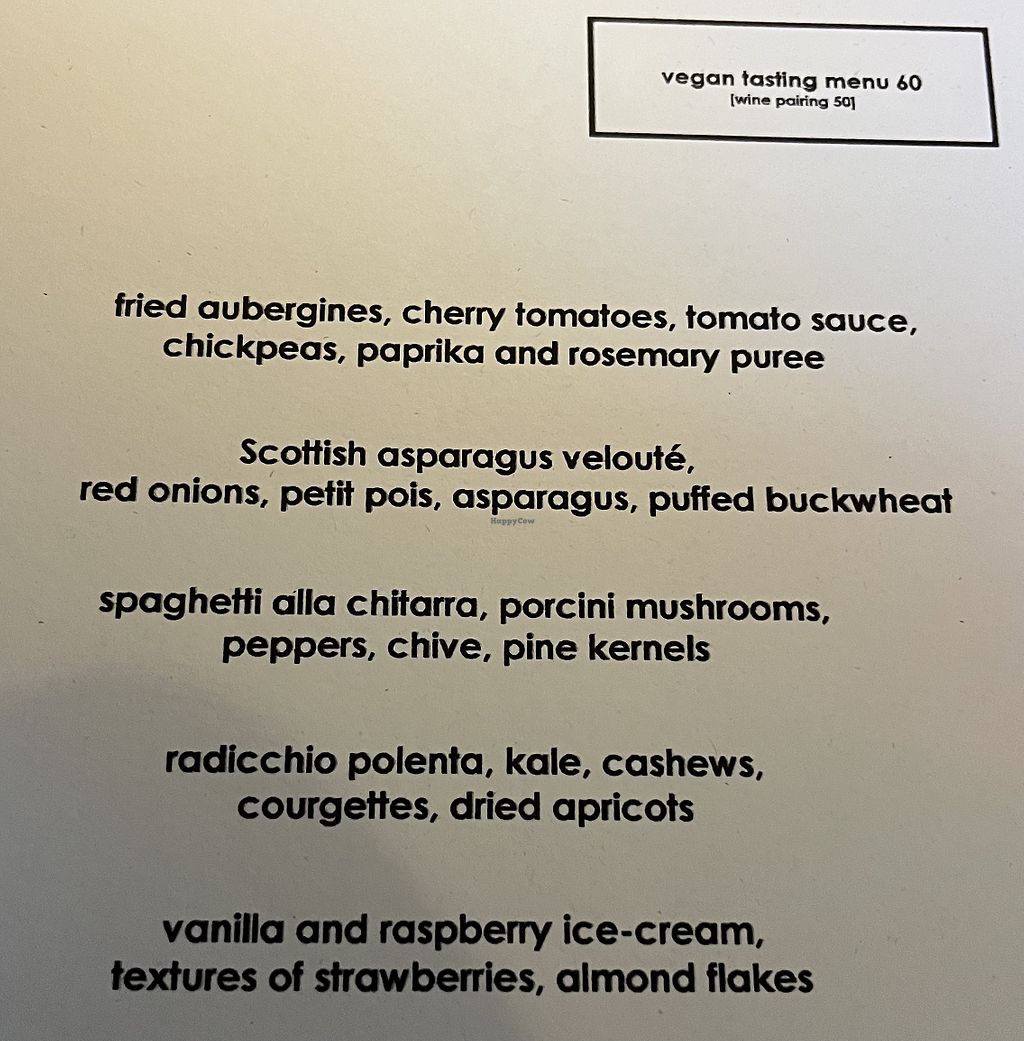 Fantastic vegan tasting menu. Vegan a la carte also available. Beautiful food, great wine and lovely service. The ambience is lovely and we thoroughly enjoyed our evening here.