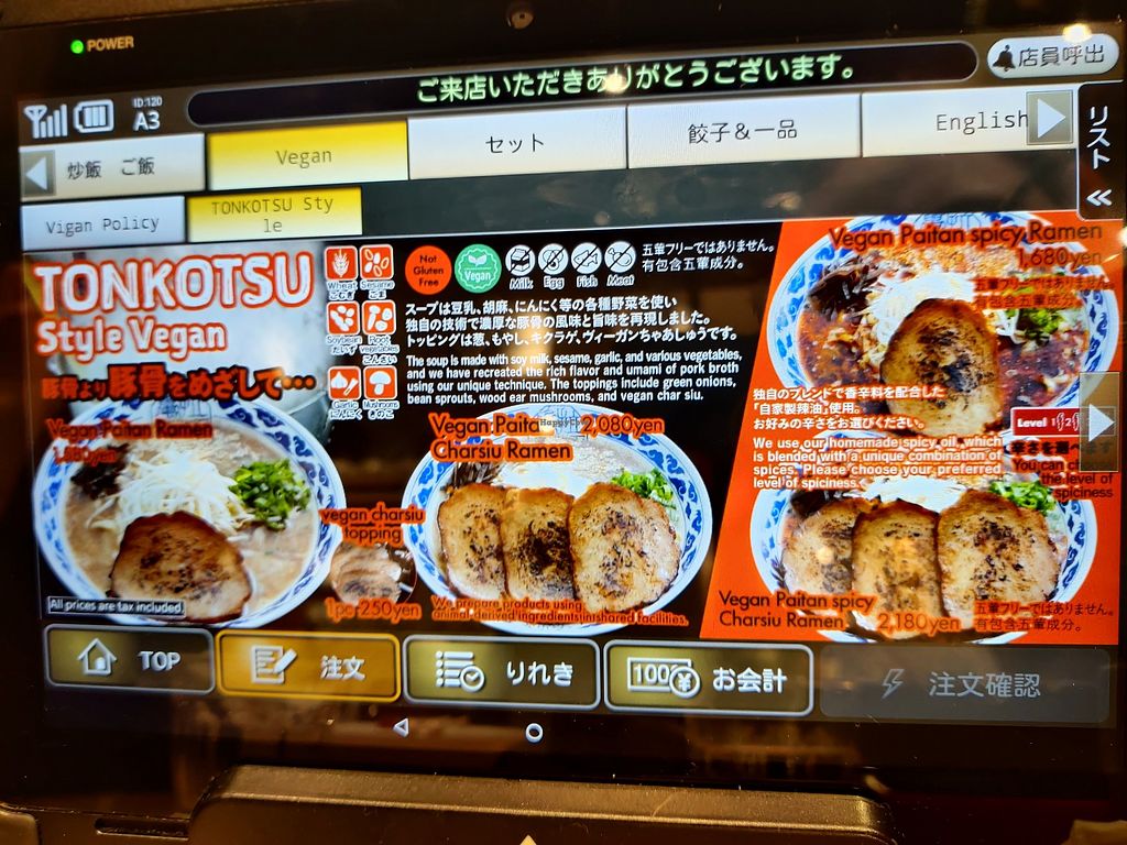 Their tonkotsu style vegan ramen with charsiu "pork" (seitan?) was very delicious. Clear tablet ordering system.
