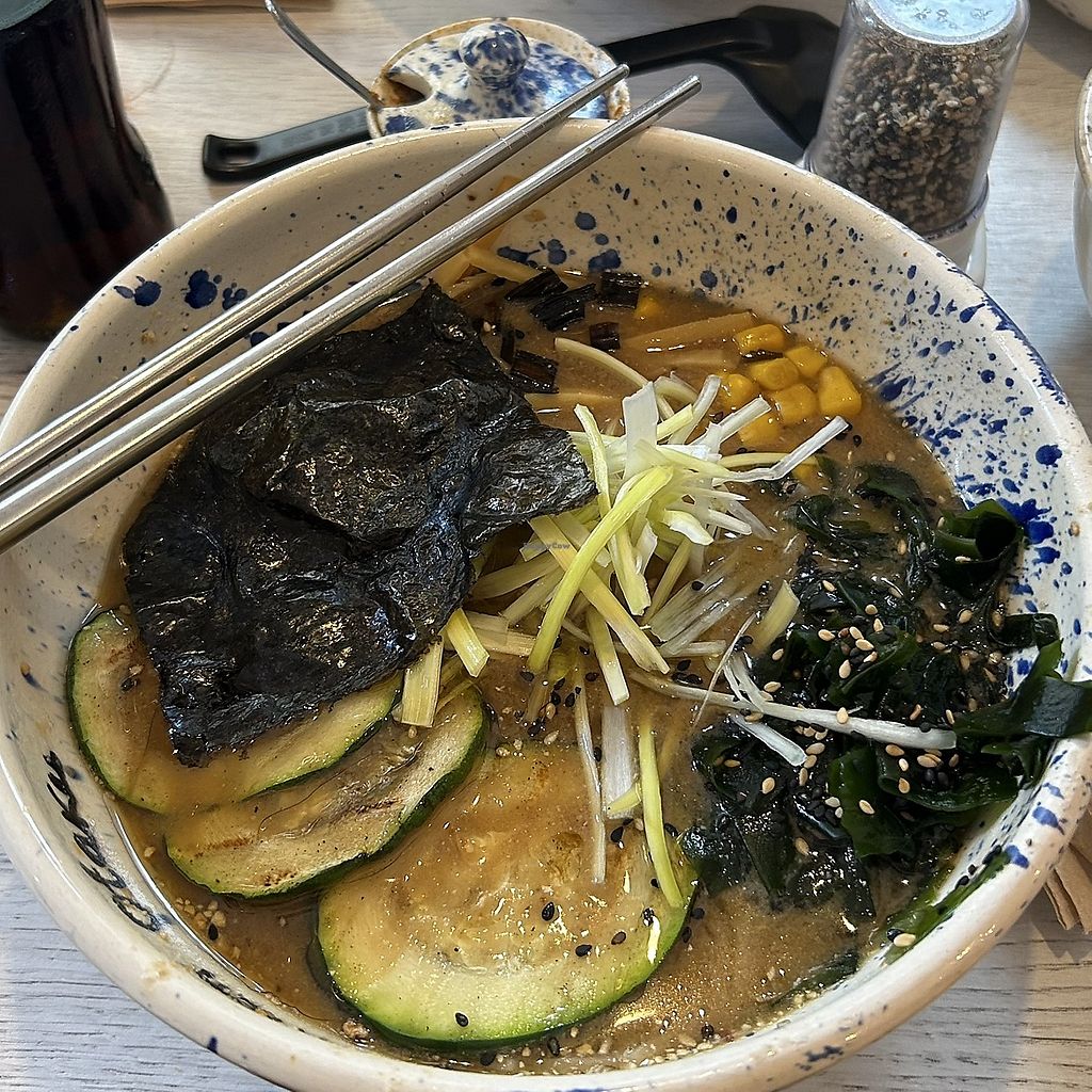 Ramen vegano de miso (para mi gusto le faltaba intensidad de miso) pero estaba muy bueno de sabor. Lástima que no se le pudiera añadir tofu.