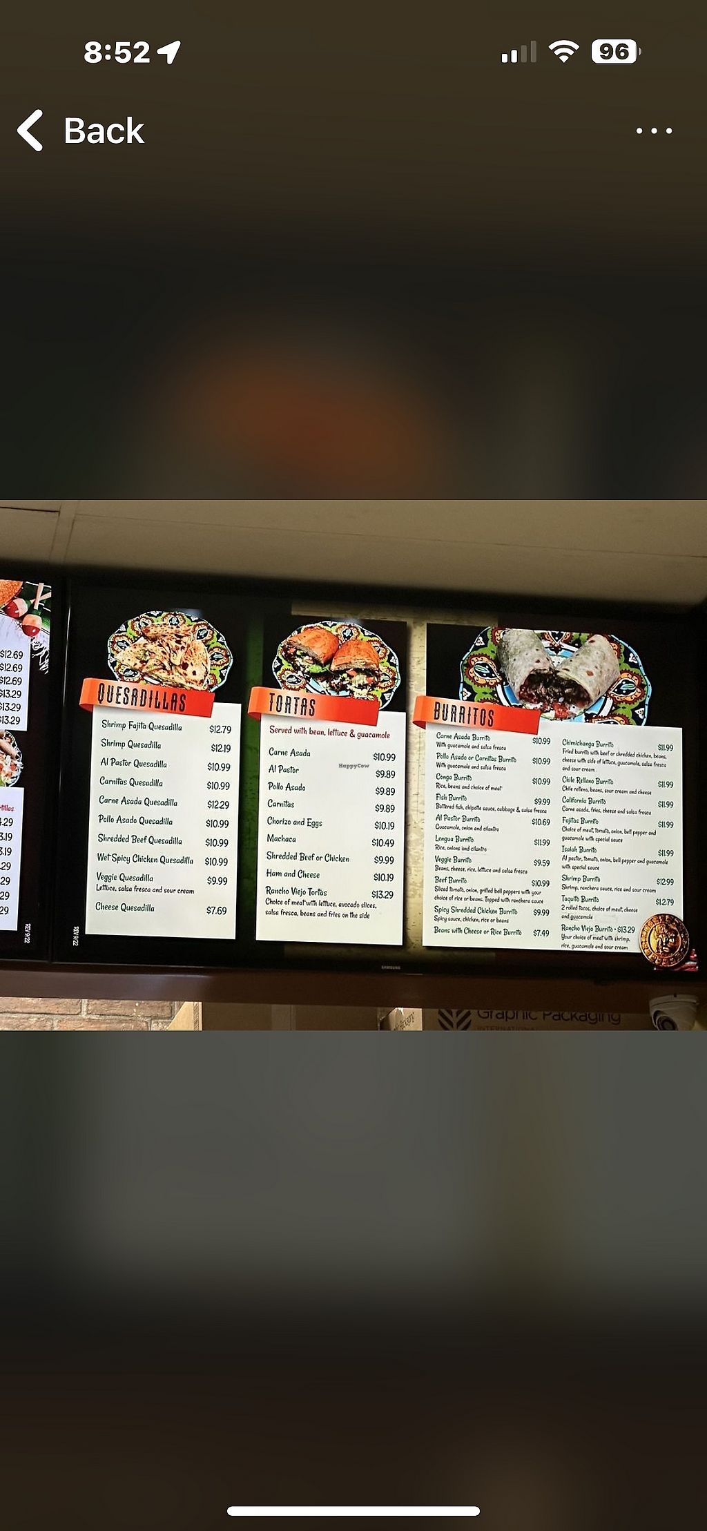 Serves meat, vegan options available. Mexican restaurant offering vegan and adaptable choices such as red & green salsa, refried beans, guacamole and burritos. Open Mon-Thu 7:00am-9:00pm, Fri 7:00am-10:00pm, Sat 8:00am-10:00pm, Sun 8:00am-8:00pm.