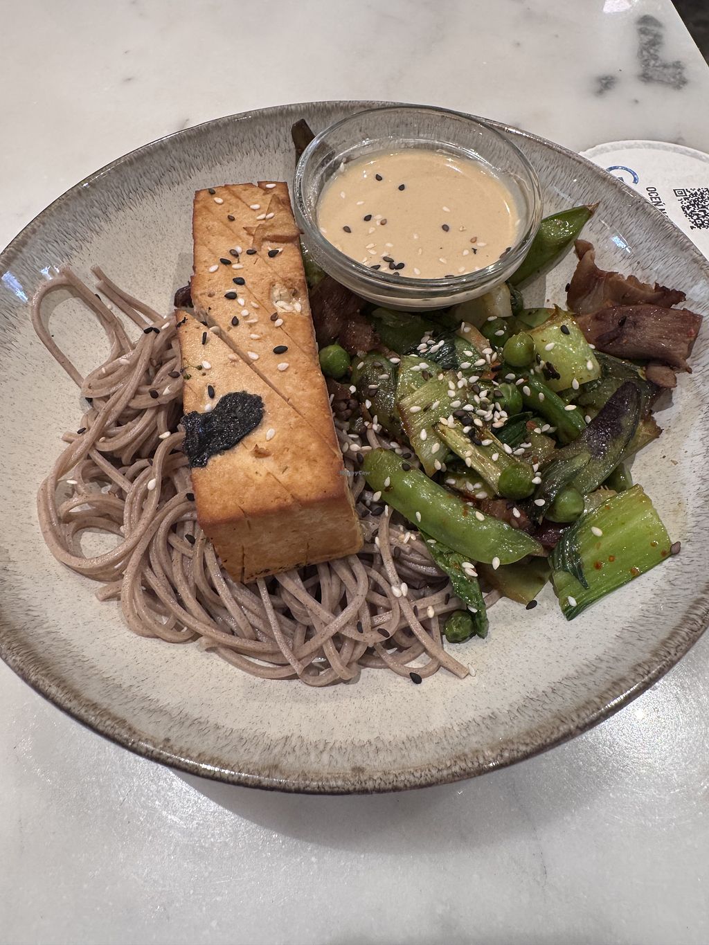 But it was worth the wait. I went for the Miso Tahini Treat, which was fantastic — soba noodles, tofu, mushrooms, and veggies. It started out as a smooth, comforting dish, but as I got into it, a surprising and fabulous heat kicked in.