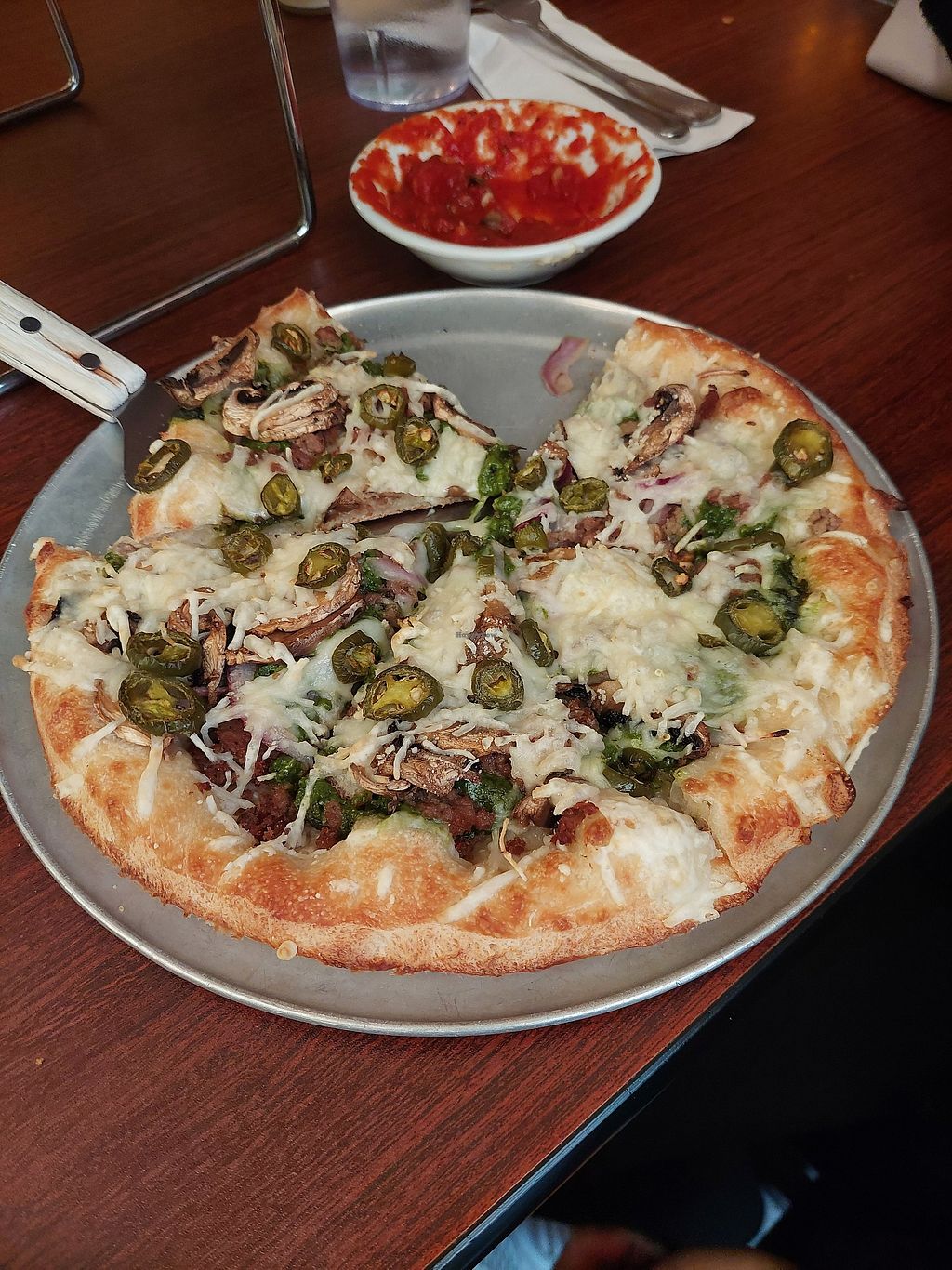 We ate a vegan gluten-free pizza and we’re blown away by how delicious it was. This was the most yummy and crispy gluten free crust I’ve had. We ordered the Thai peanut pizza with gluten free crust. They have an entirely vegan Manu. The house salad was just ok.