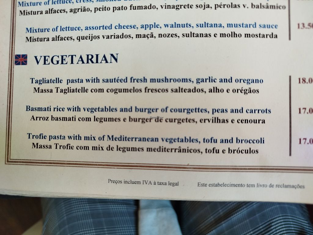 Serves meat, vegan options available. Portuguese restaurant offering a vegetarian section with pastas and rice with a burger patty & vegetables. Specify vegan. Open Mon-Sun 12:00-22:30.
