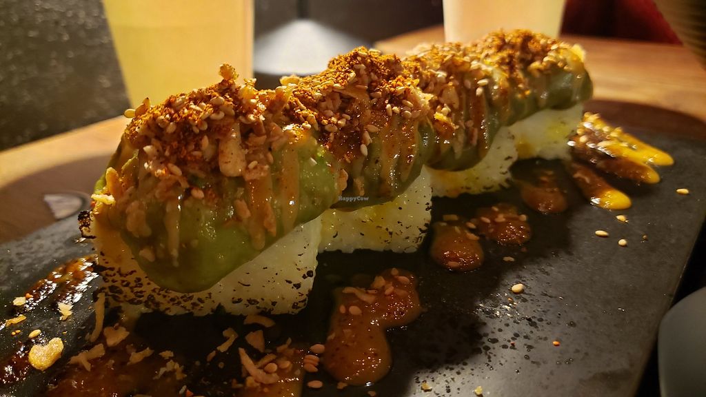 Spicy avocado sushi ($10). Terrible. Avocado paste on top of blocks of…