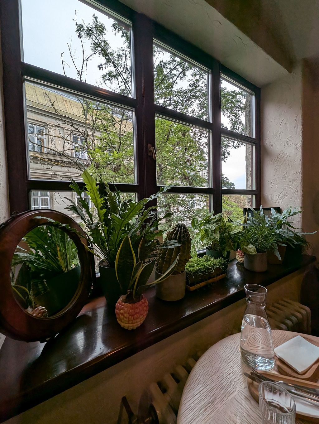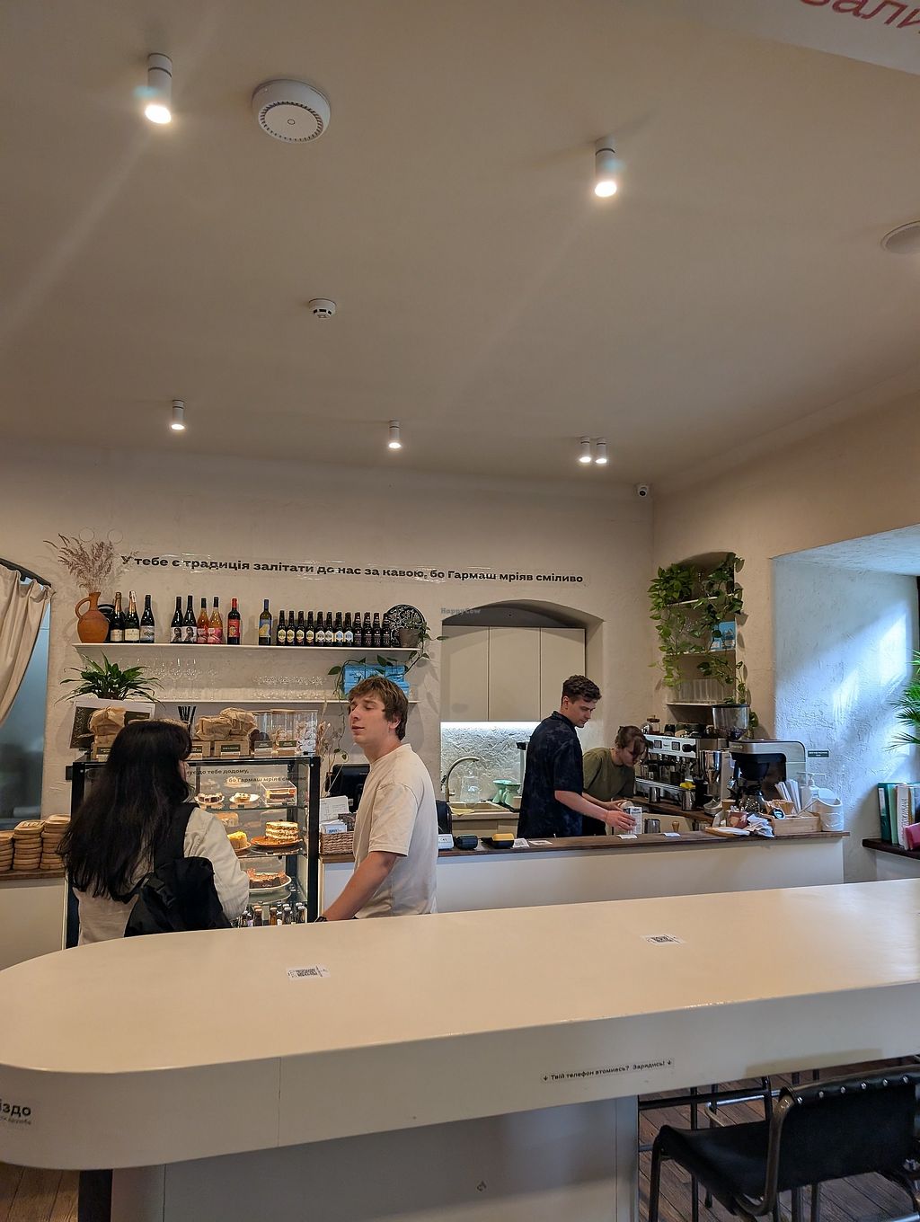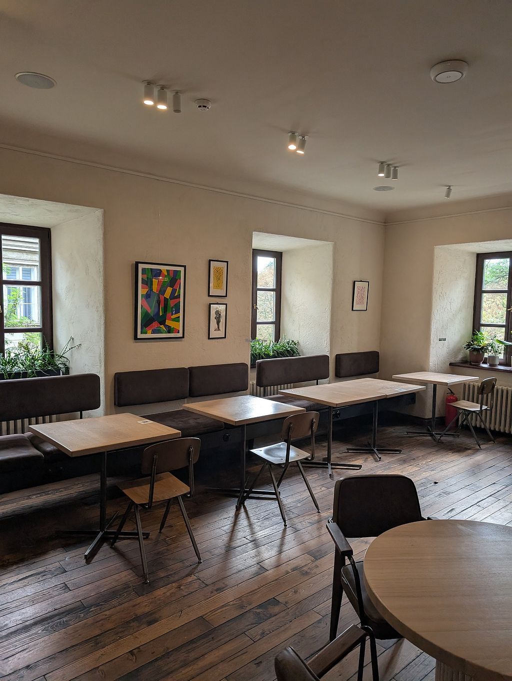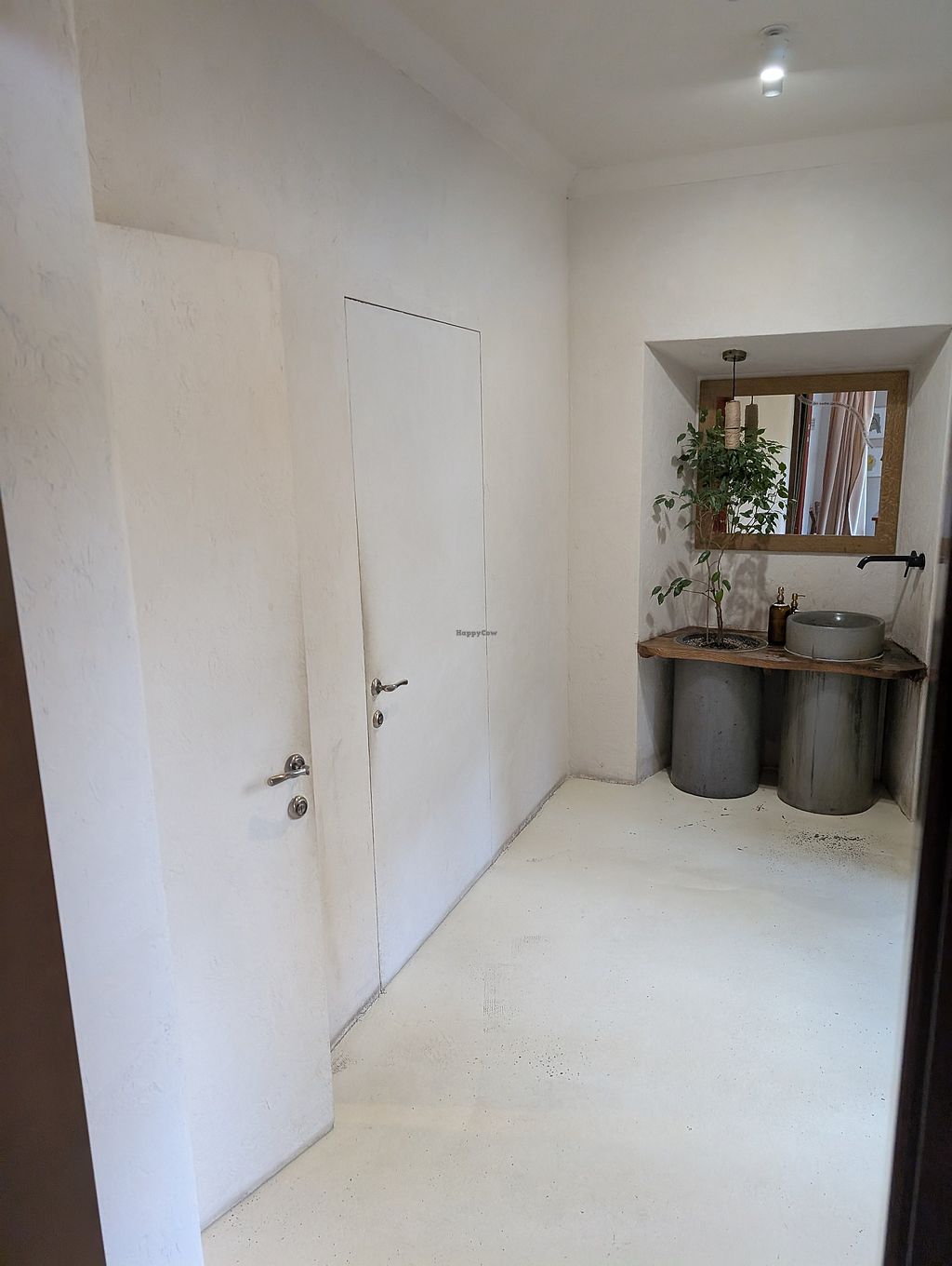 Serves meat, vegan options available. Fusion café offering clearly marked vegan choices including tabbouleh, roasted pepper soup, hummus with apricot harissa, caramel hazelnut cheesecake, vegan ferrero, as well as plant-based milk alternatives for drinks.