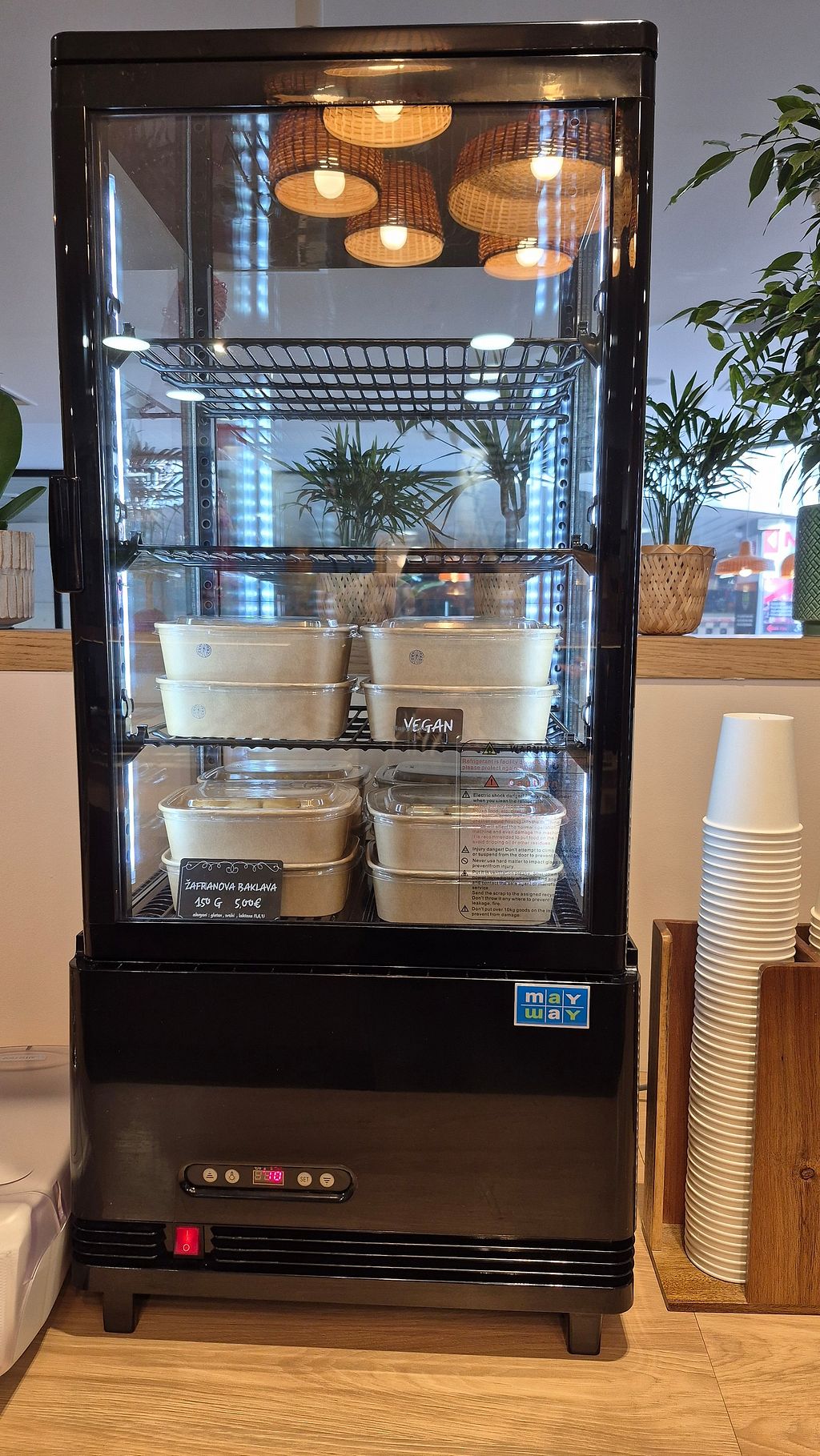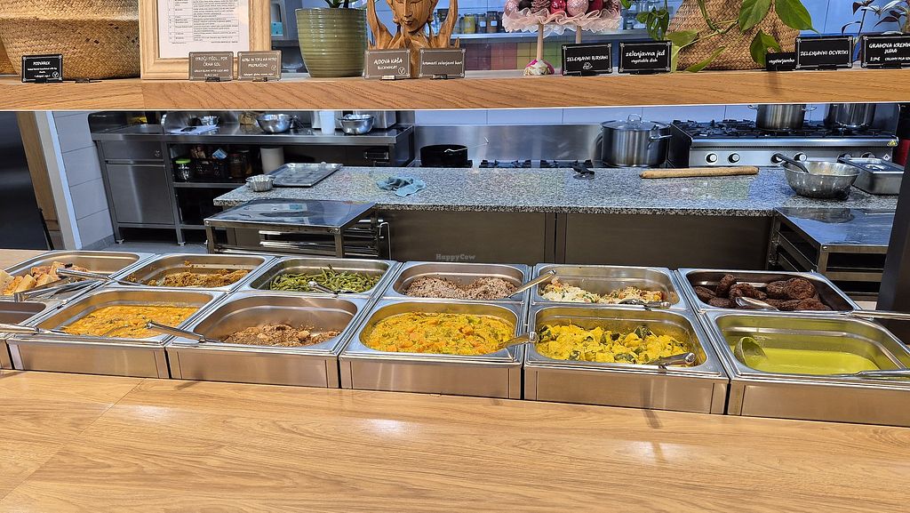 Fully vegetarian restaurant in the center of Ljubljana (Ajdovščina underpass) offering vegan and vegetarian lunches and desserts. Features a buffet and salad bar with dishes from various cuisines for custom plates. Vegan options have included falafel, Mediterranean antipasto salad, hummus, vegan apple cake, vegan baklava, and more. Open Mon-Fri 11:00-18:00. Closed Sat & Sun.