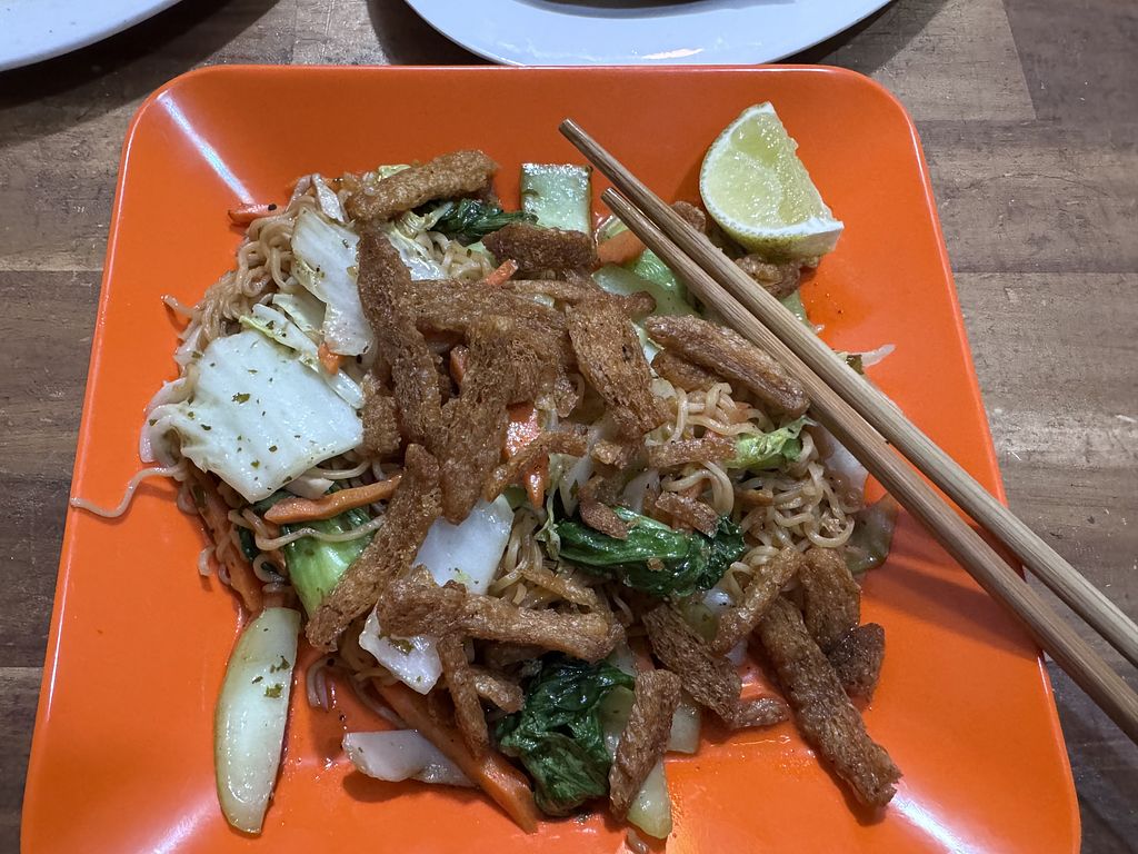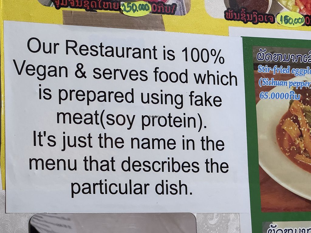 They have a very extensive menu, all vegan, and the food is good. We ate there 4 times during the 2 day stay in Vientiane. The papaya salad was very authentic and nice, just a bit spicy for us. Pretty much everything we tried was good and came really quick — which is impressive because the food tasted fresh, didn’t seem like precooked.