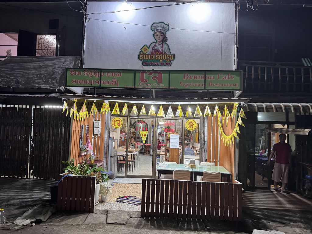 Small vegan restaurant. Has an extensive menu with English and some food photos. Includes curries, papaya salad, juices and smoothies. Owner speaks English and French. Direction: go west along Samsenthai, cross Khun BuLom on your right is Somkiat vehicle part with an ad for Bridgestone, turn right up the narrow street immediately after the sign. after 100m you will come to 2 restaurants displaying yellow vegan banners. Reunion is on your right, on your left is Phounsub Restaurant. Open Mon-Sun 9:00am-9:00pm.
