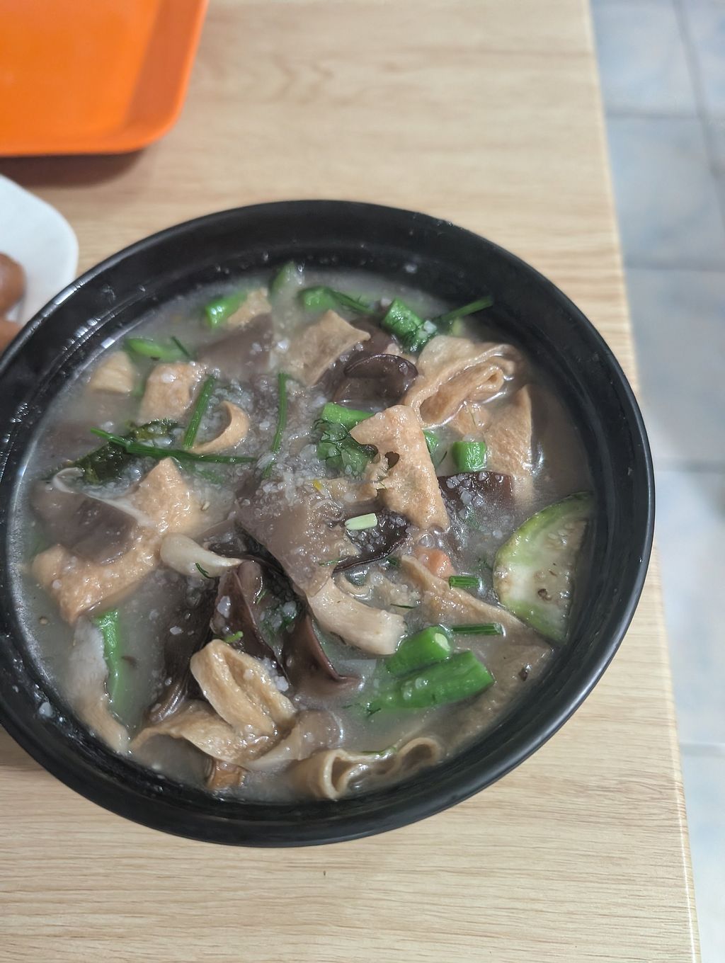 Cons: Owner family played phones full volume over music, Over emphasis on meat substitute dishes, Plastic packaging food in food