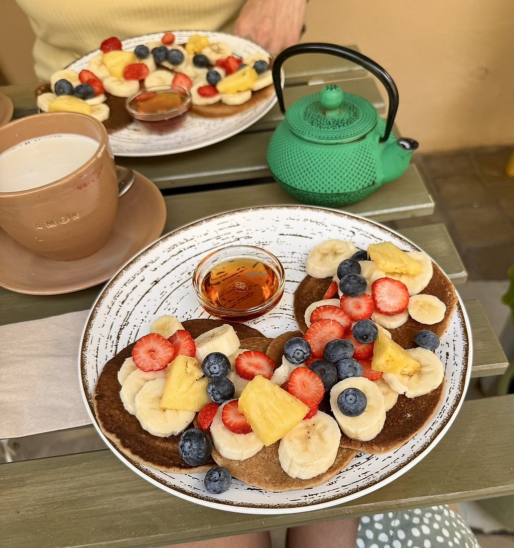 I had the sweet pancakes with fruit, it was absolutely excellent, with a cappuccino with oat milk was great. It was busy enough to not wait but had lots of life there. In door and outdoor seating. I sat outside in Jan. It was great.
