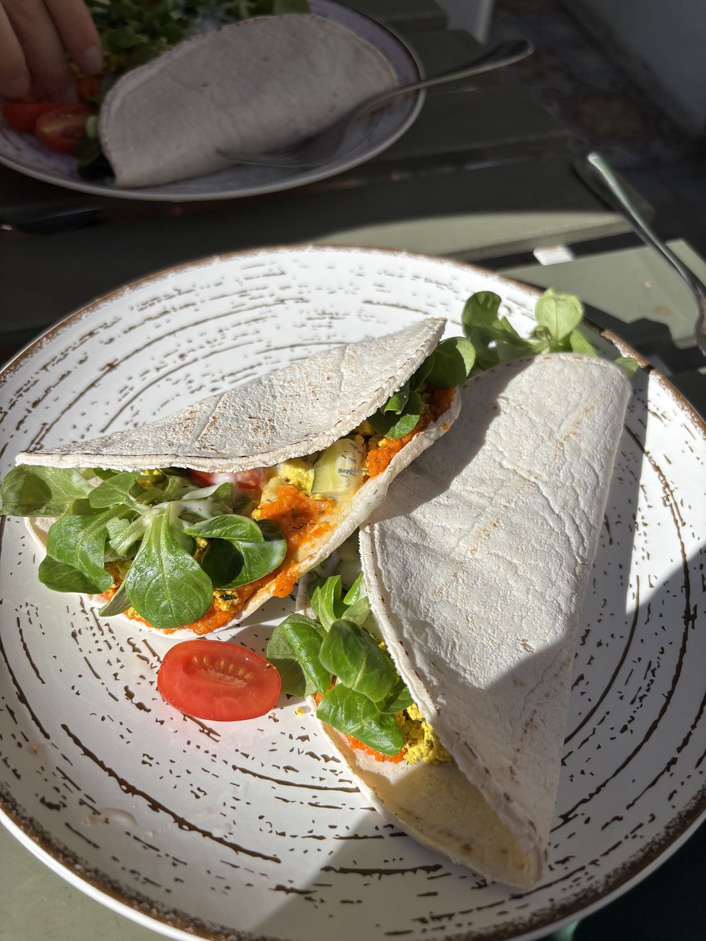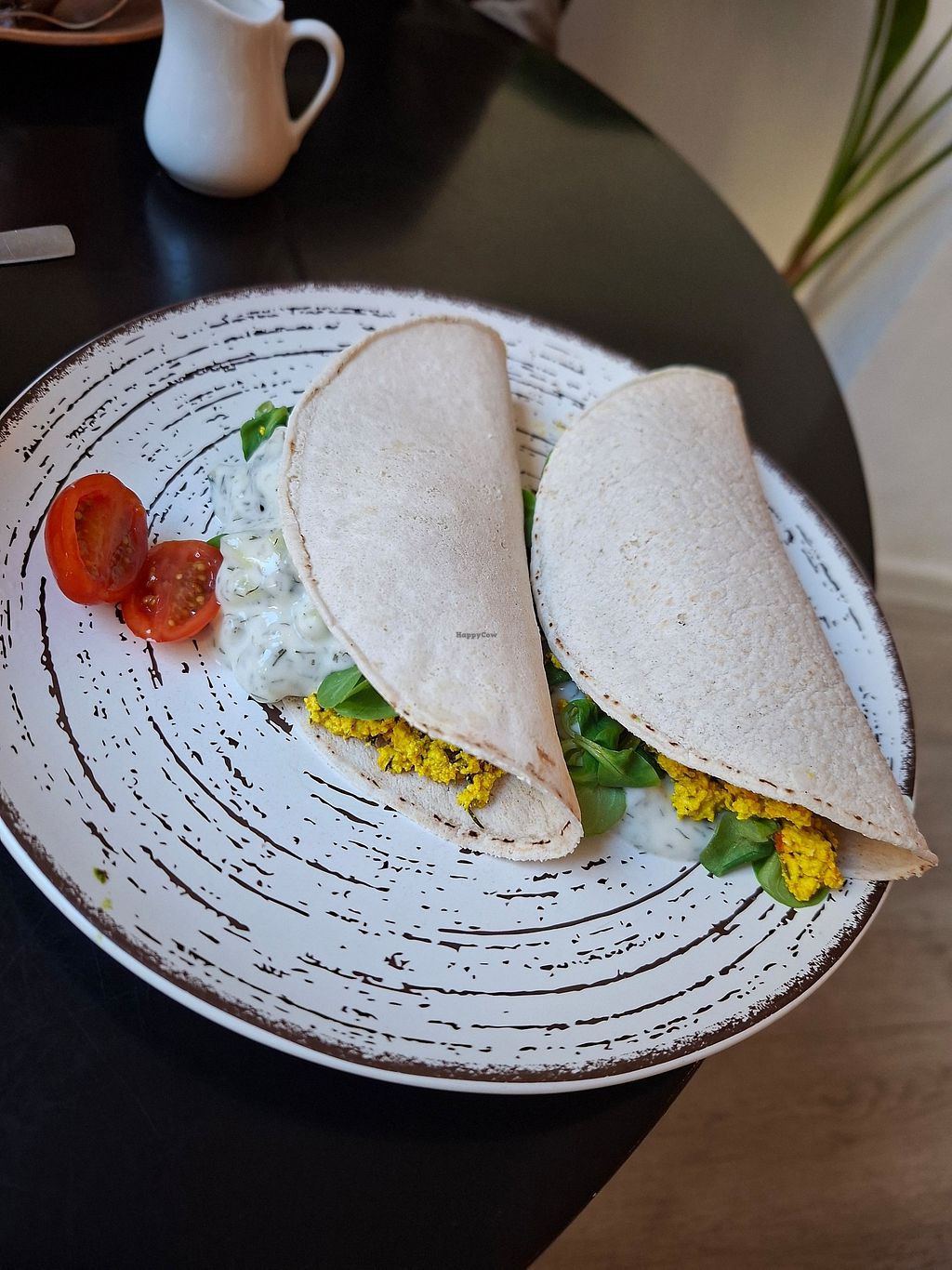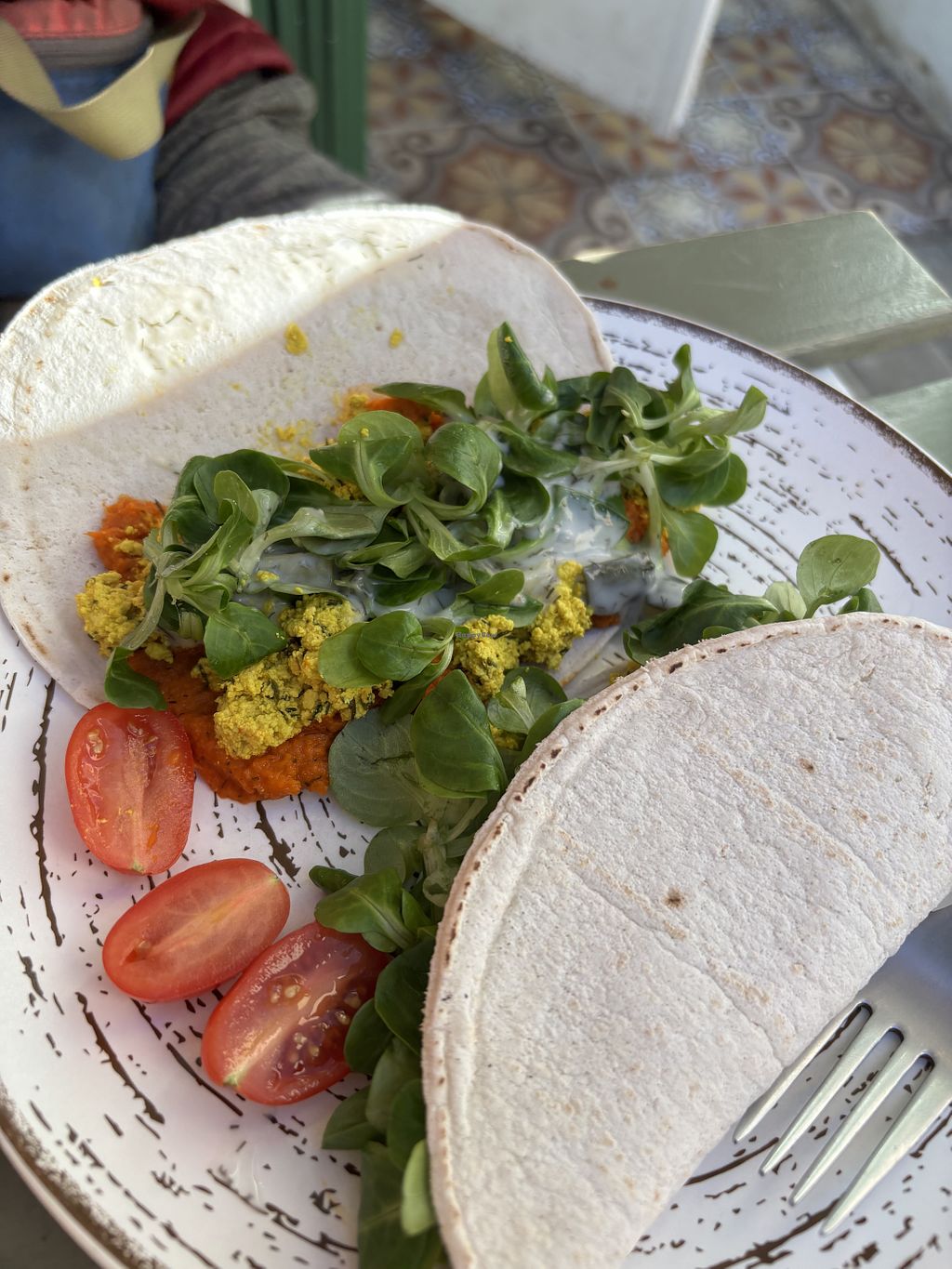 Had the tofu scramble. It was two soft tacos with tofu scramble, leaves, tomato,