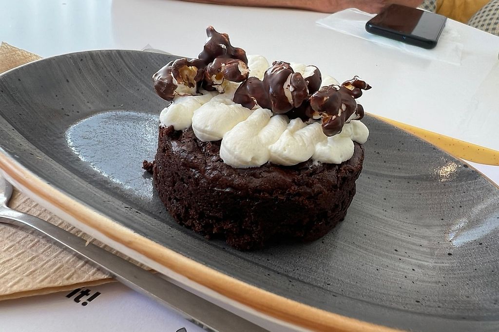 chocolate brownie with whipped cream and chocolate covered popcorn