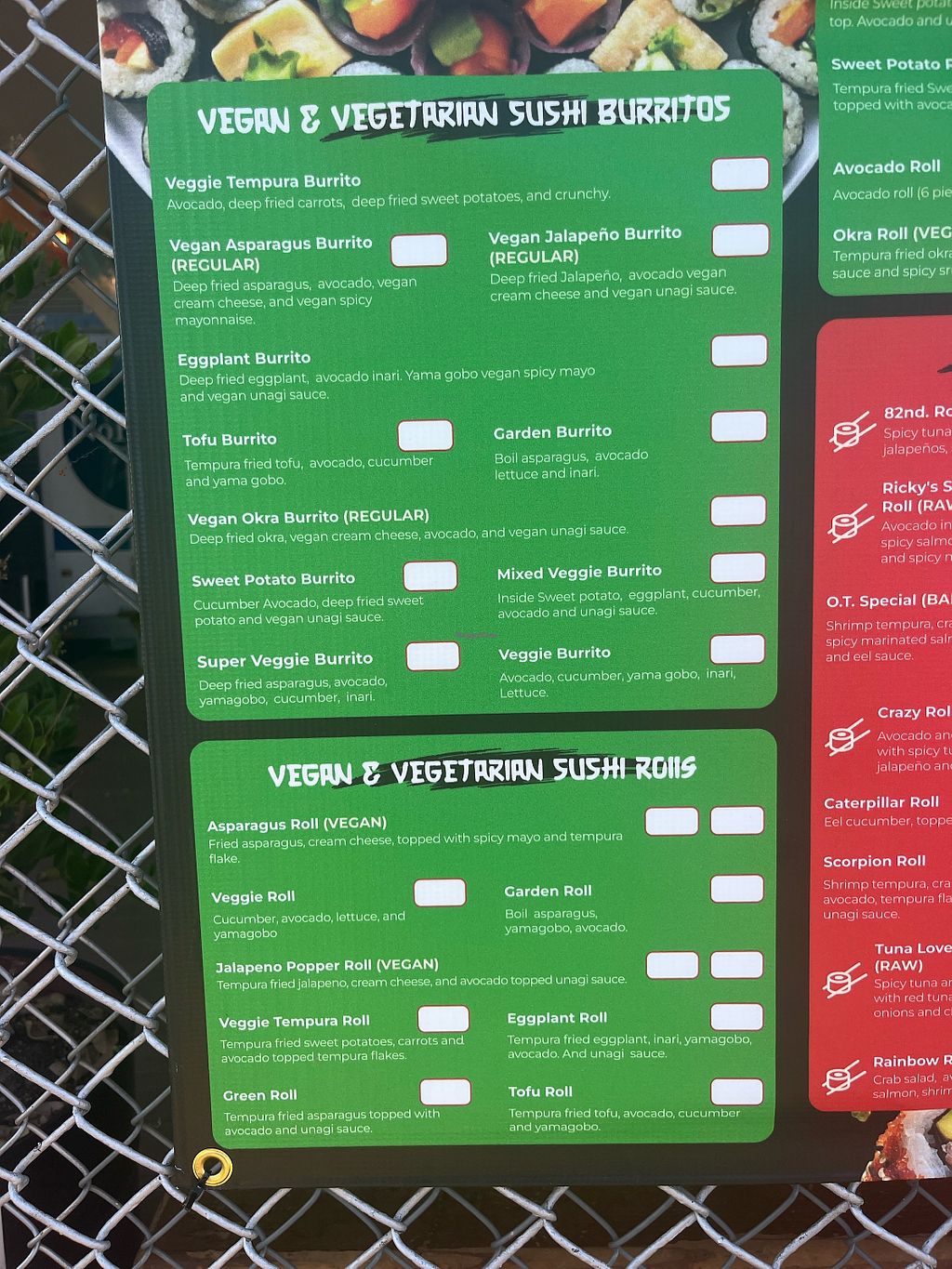 Vegan items are clearly identified, I recommend the rolls over the sushi burritos, prices are affordable. Staff is friendly. Covered outside seating is nice.