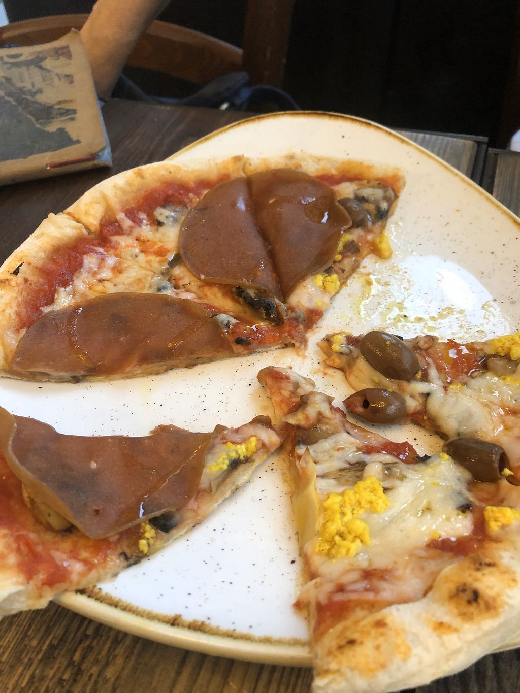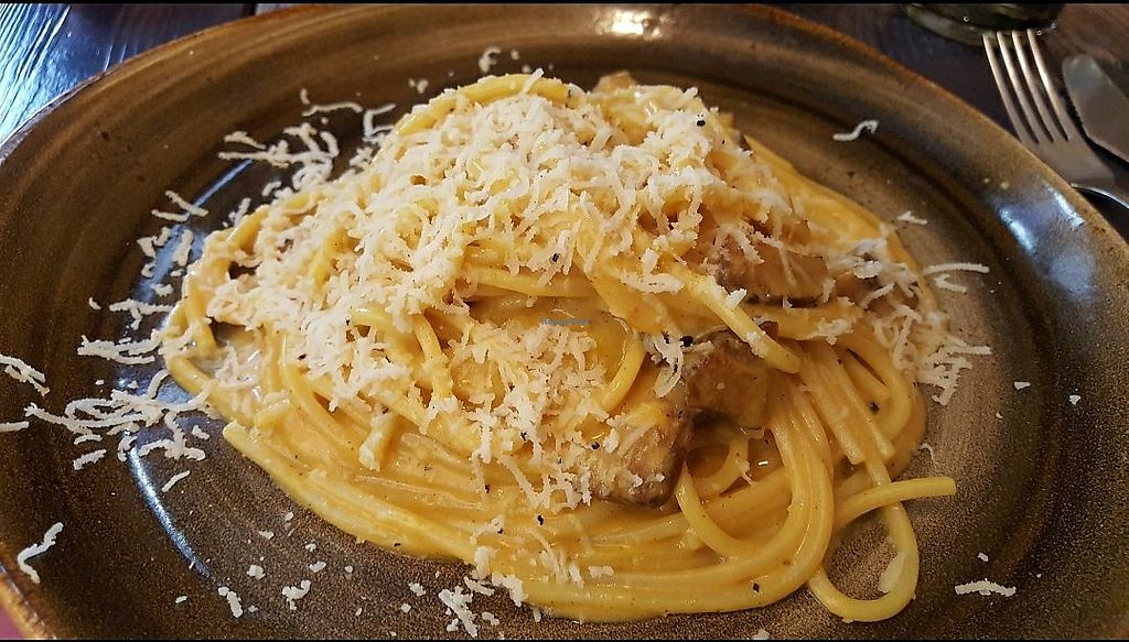 creamy vegan pasta with smoked seitan, vegan cheese and black pepper