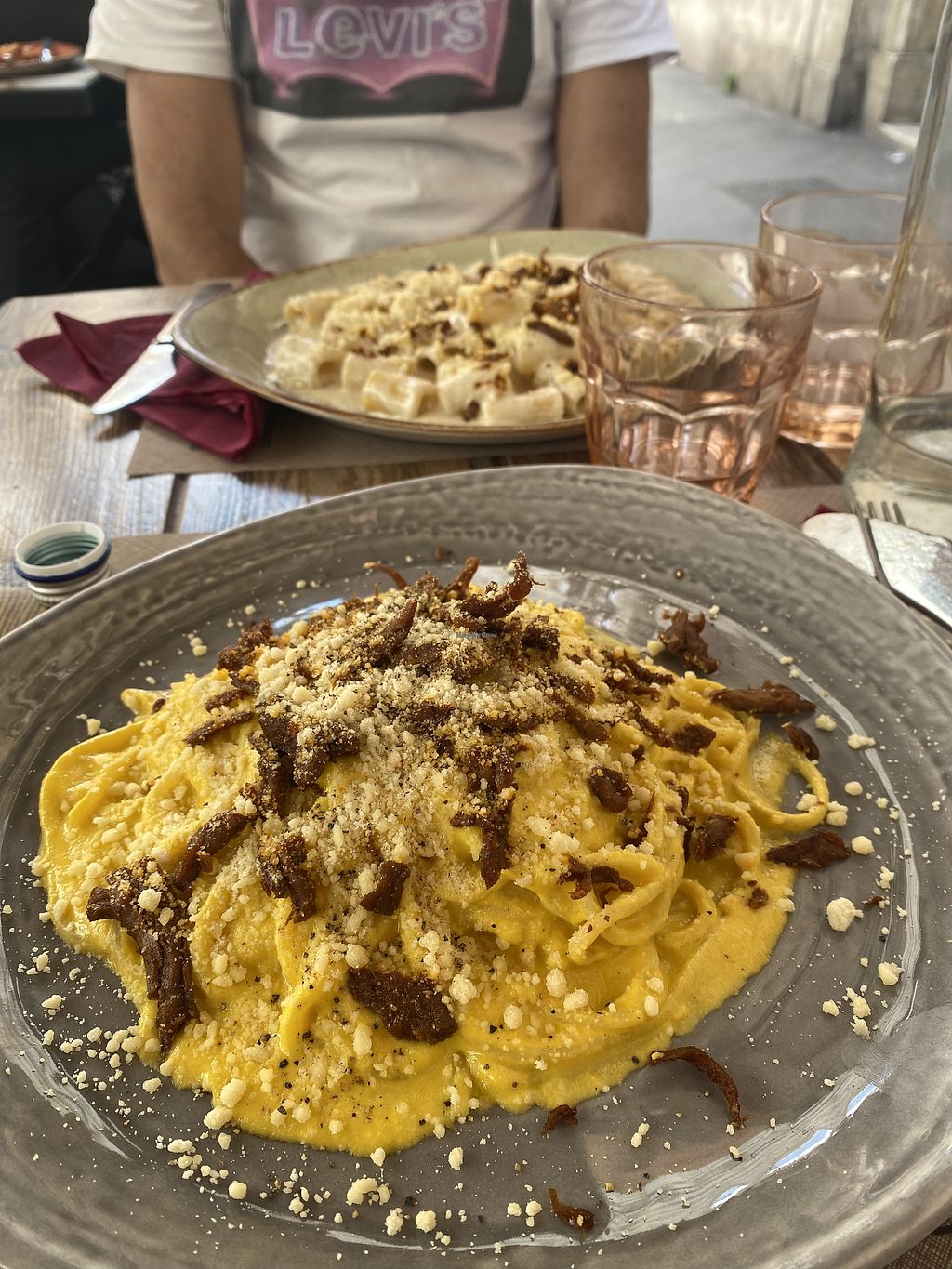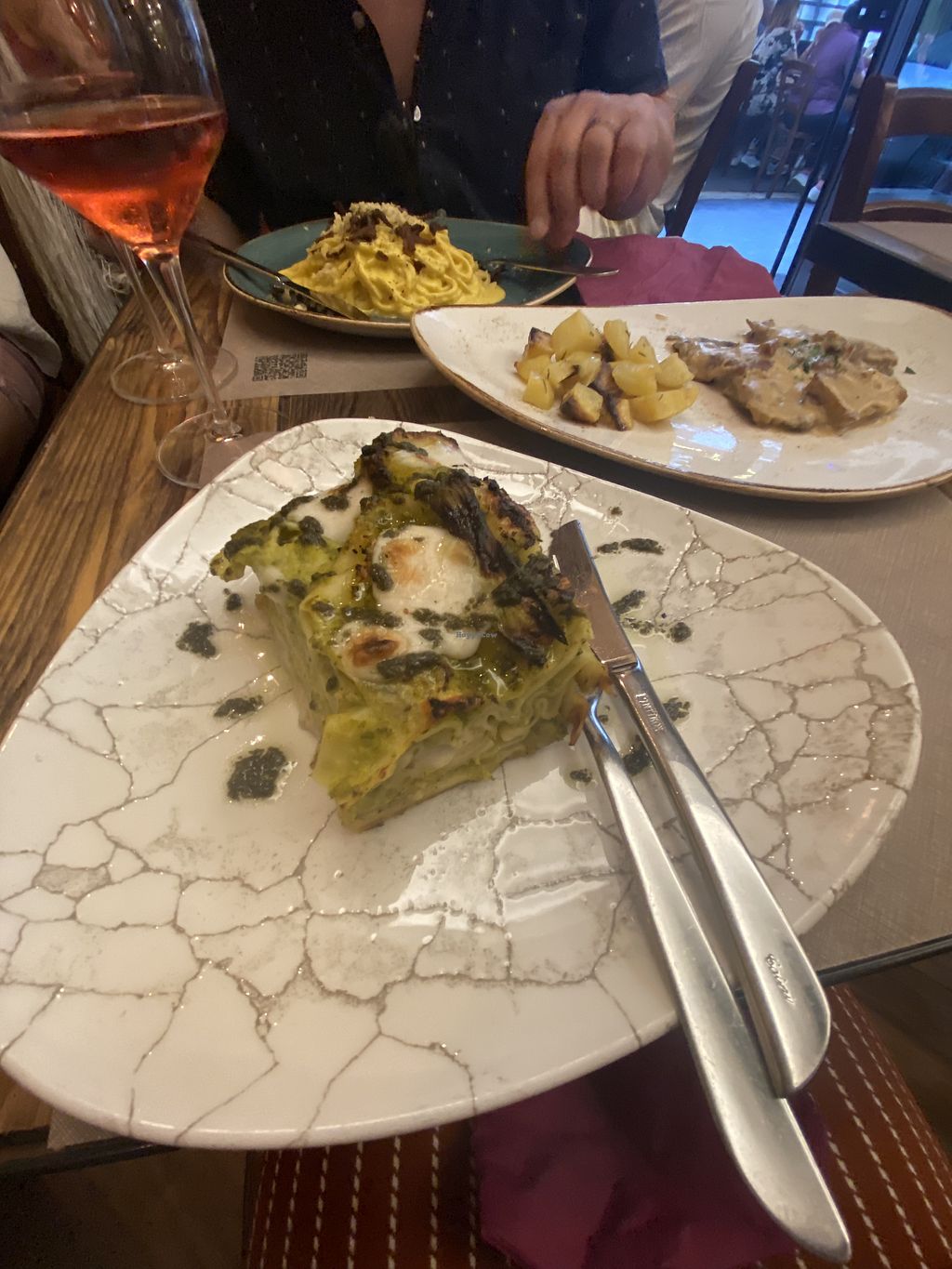 The zucchini lasagna with squash blossom cream was literally my favorite meal I’ve ever had. They serve first & second courses but pace yourself because the servings were pretty decent and we could have had 2 rather than 3 dishes to share between us! Also allow some time- it was extremely busy and took about an hour and a half for us to have dinner. Definitely need a reservation but definitely worth it!