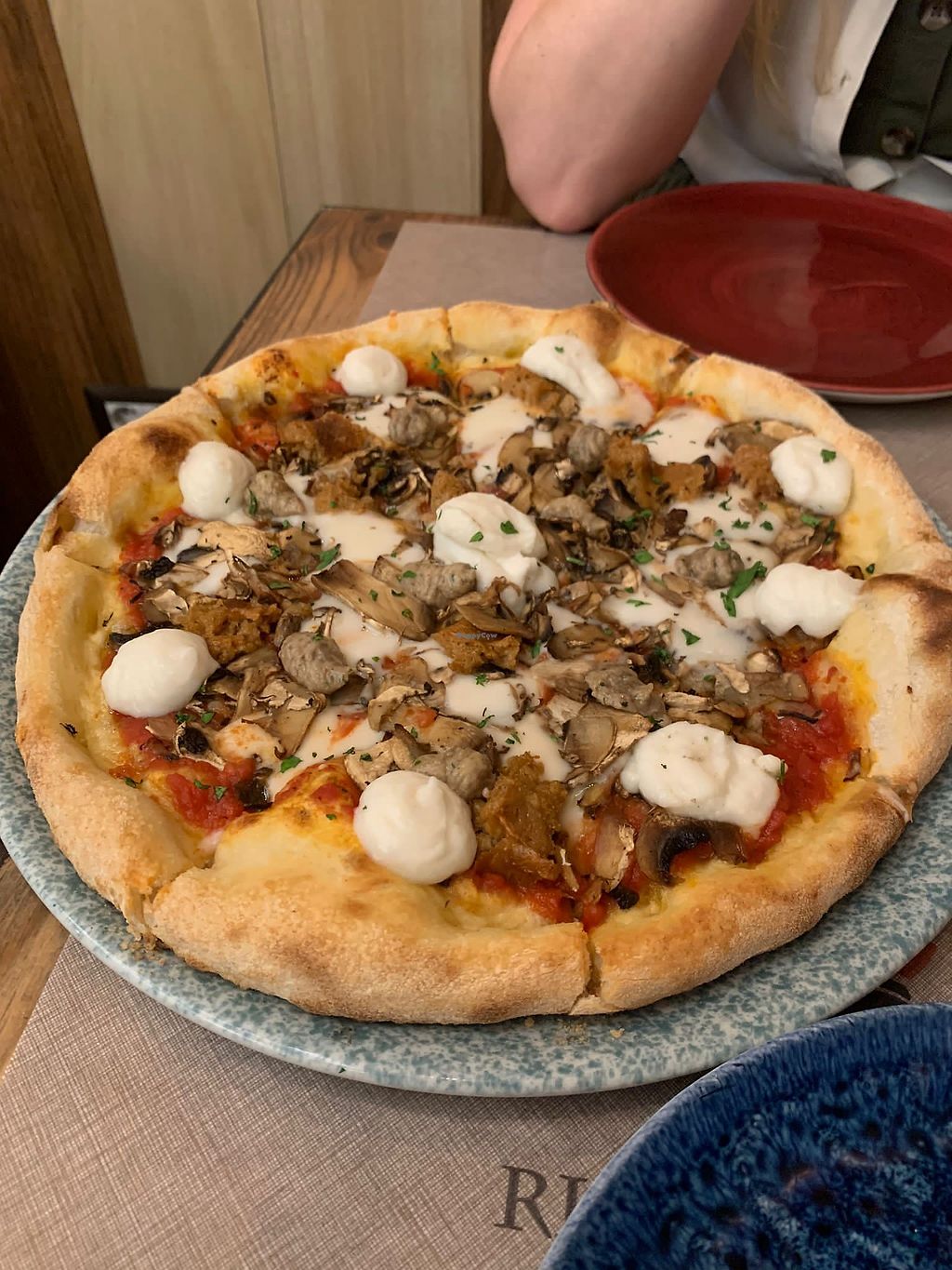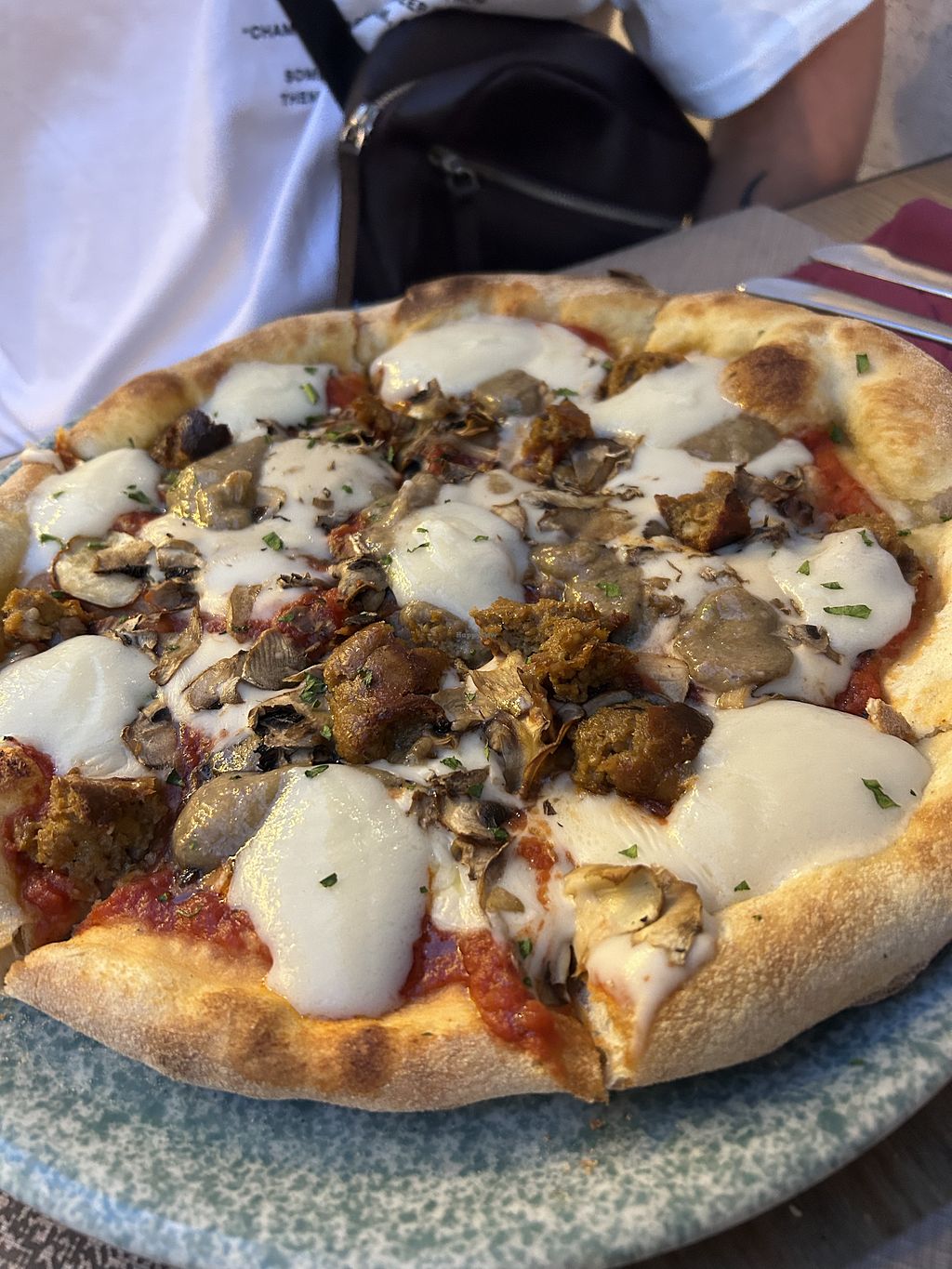 We had the faux sausage pizza. I’m not a massive faux-meat fan, but my husband loves it so I mainly went with his choice. The base and cheeze were great, and overall I still enjoyed this and he loved it.
