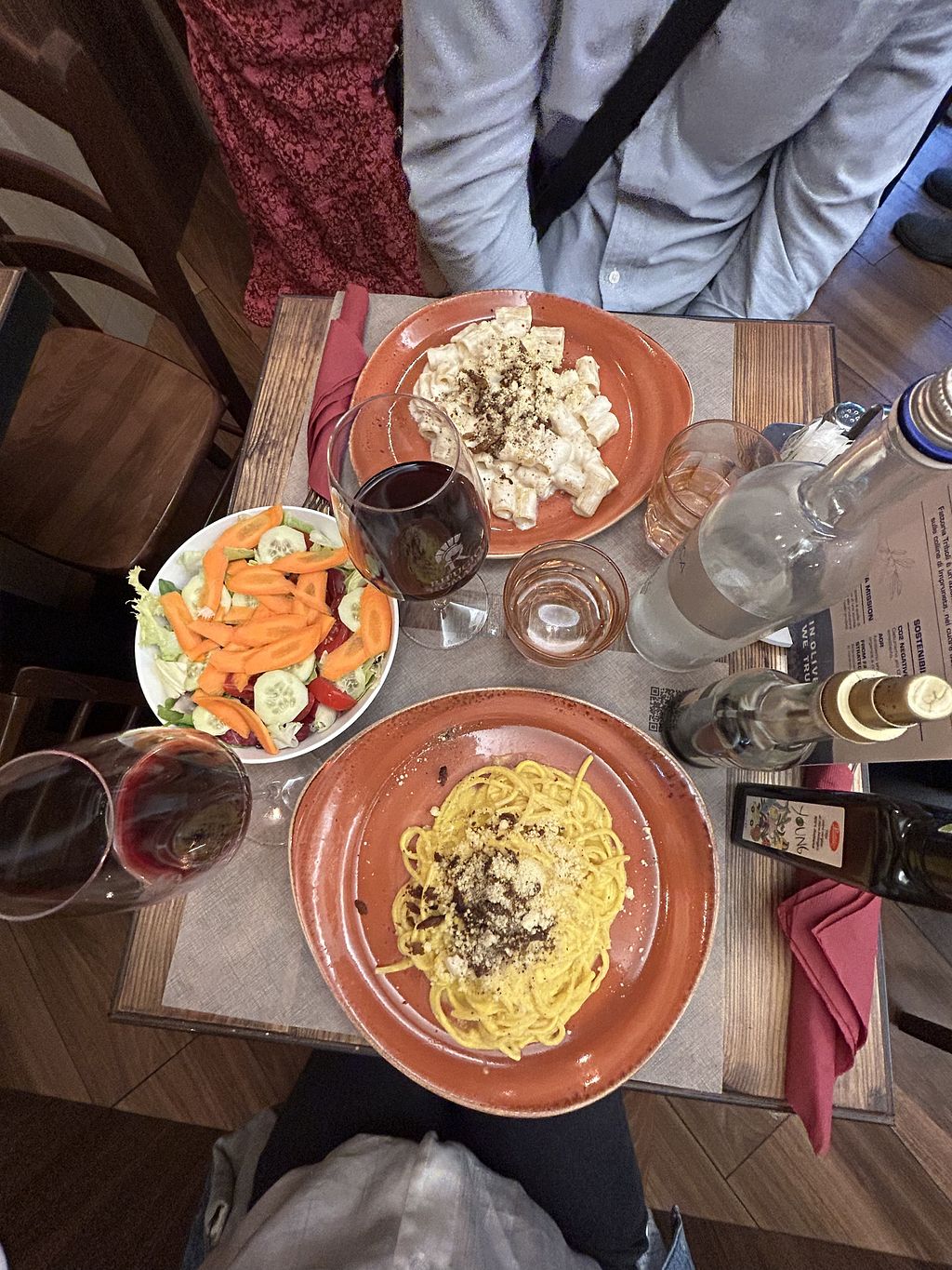 We went to dinner here twice during our stay in Rome. The first night we had a salad and pizza. The salad wasn’t very good. The pizza was pretty good. The second night we ordered pasta dishes and Toramisu and it was all amazing.
