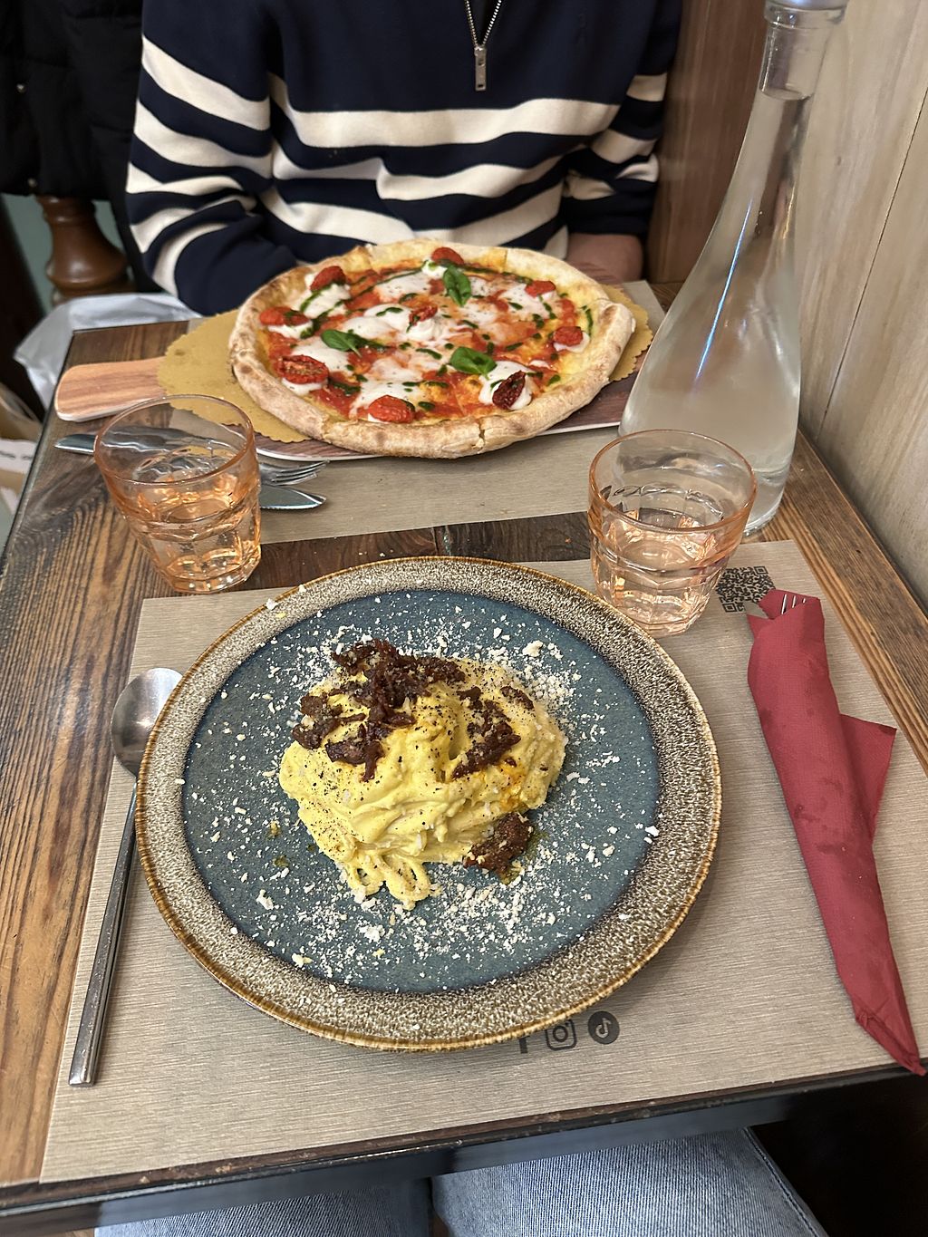 Their menu offers a variety of options, all of which look fantastic. We ate bruschetta nduja, spaghetti alla carbonara, and pizza boscaiola. I was pleasantly surprised, and I wished I had also tried their desserts.