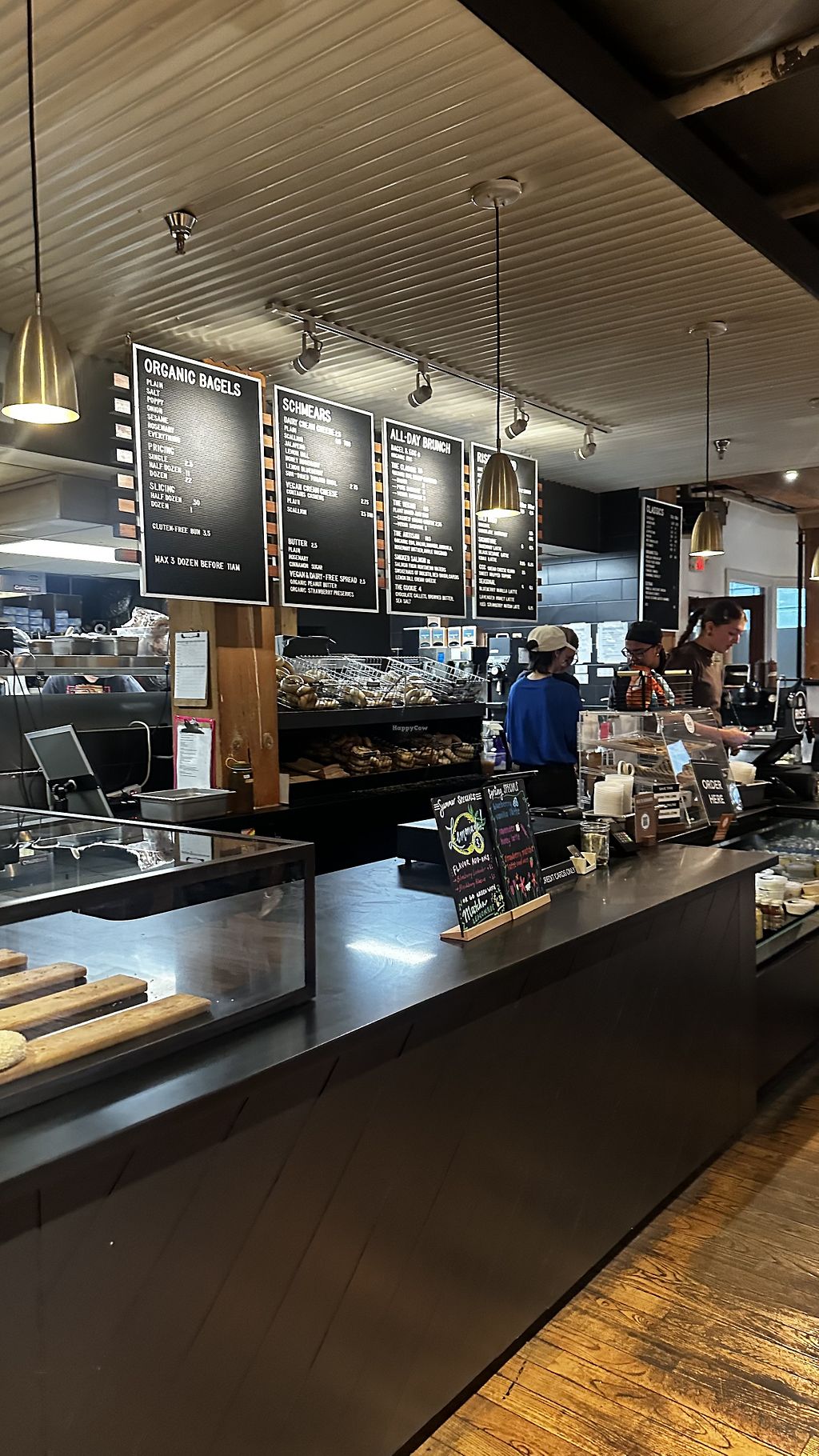 Vegan spreads available and also the mock lox bagel is vegan if you get one of the vegan cream cheeses. Very tasty! Hip and trendy atmosphere. Minimalist modern cafe.