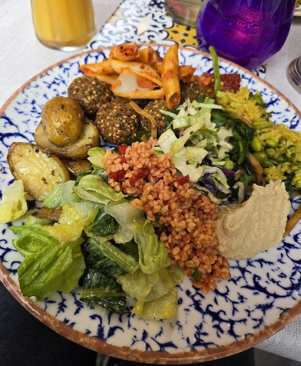 The mediterranean lunch buffet was super lovely! All food was vegetarian, and loads of vegan options. Different types of salad, hummuses, and vegetable dishes. Felt very fresh😄