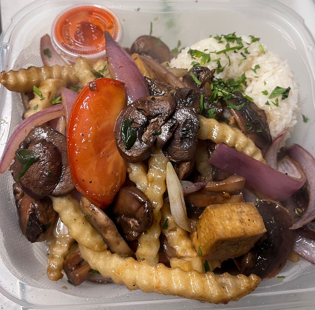 Come try the Vegan Crispy Tofu & Mushroom Saltado Platter served with Garlic Creole Rice! Serving up major Umami!