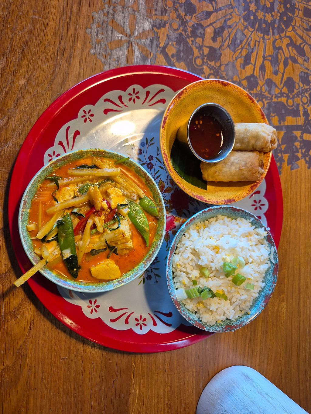 We ordered from the lunch express menu and I had Tamarind Tofu as a starter and Butternut Cashew curry, my partner had Spring Rolls and Butternut Cashew curry, we also shared a portion of Pumpkin Crackers. We asked for it all to be vegan (just in case of fish sauce etc). The lunch express menu items all come together which didn't bother us in the least. The service and food were both very good, and we look forward to returning for an evening meal. The day we visited was pretty quiet and we had a lovely view over the Albert Dock.