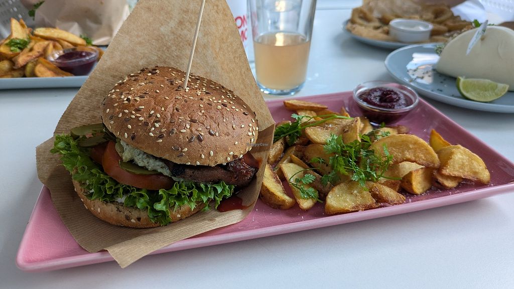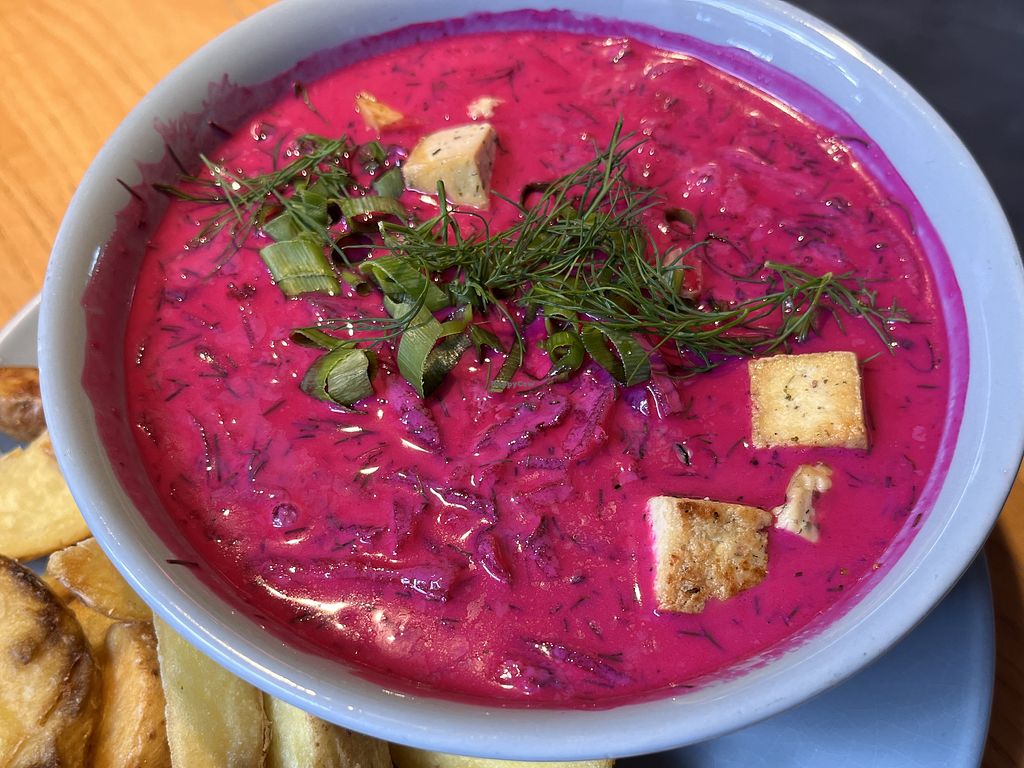 Vegan version of Lithuania’s pink soup was delicious. Vegan fish and chips and the tofu burger were both great too. The tofu burger had a generous slab of tofu in there