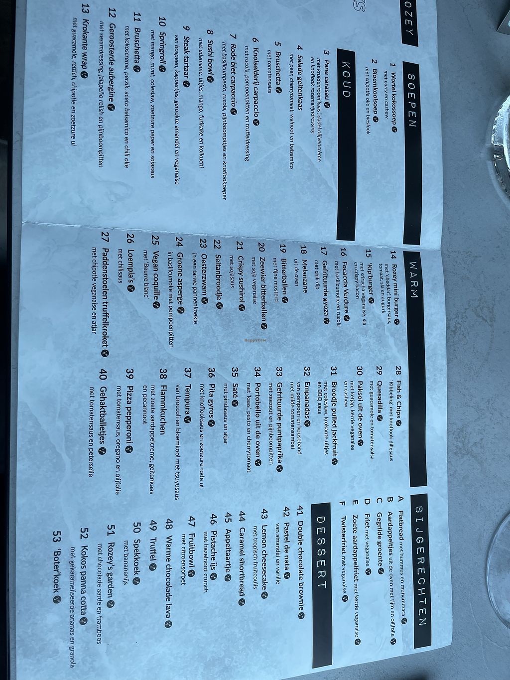 11 Bruschetta, 16 Focaccia Verdure, 14 Rozey mini burger, 15 'Kip'burger, 21 Crispy sushiroll, 23 Oesterzwam 'Peking Style', 29 Quesedilla, 36 Pita gyros, 37 Tempura, 39 Pizza pepperoni, 44 Caramel shortbread, 50 Spekkoek, 48 Warme chocolade lava, 51 Rozey's garden, 52 Kokos panna cotta, 53 Churro