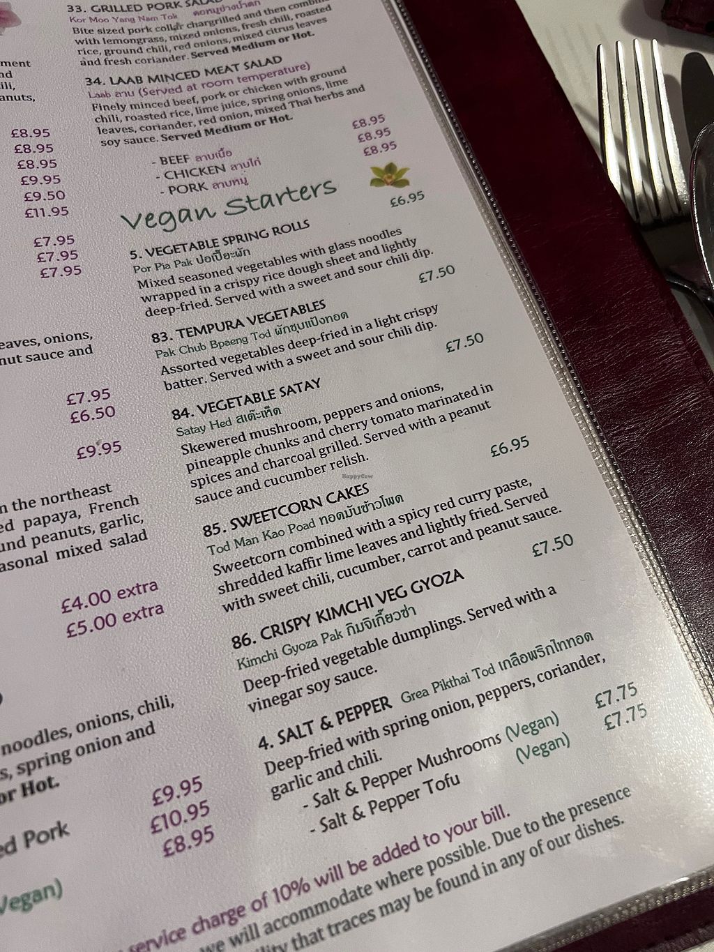Amazing food and lots of vegan options. Whole page of the menu for vegans and a section for vegan starters. They even made the papaya salad vegan for us even though it’s not listed as vegan on the menu. Highly recommend! Only four stars as not fully vegan menu.