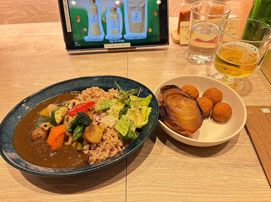Spinach Curry with Roasted Veggies, Falafel and Fried Tofu Tonkatsu