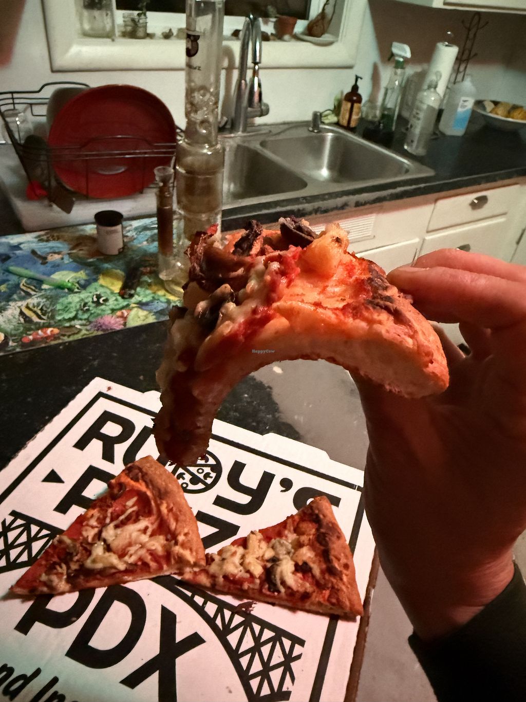 The crust is incredible - chewy and perfect. I’m partial to the Vegi-Ru (off menu) and the stuffed bell pepper pizzas. So many vegan options that never disappoint! I love that they offer Daiya or Follow Your Heart cheeses. Rudy’s rocks!