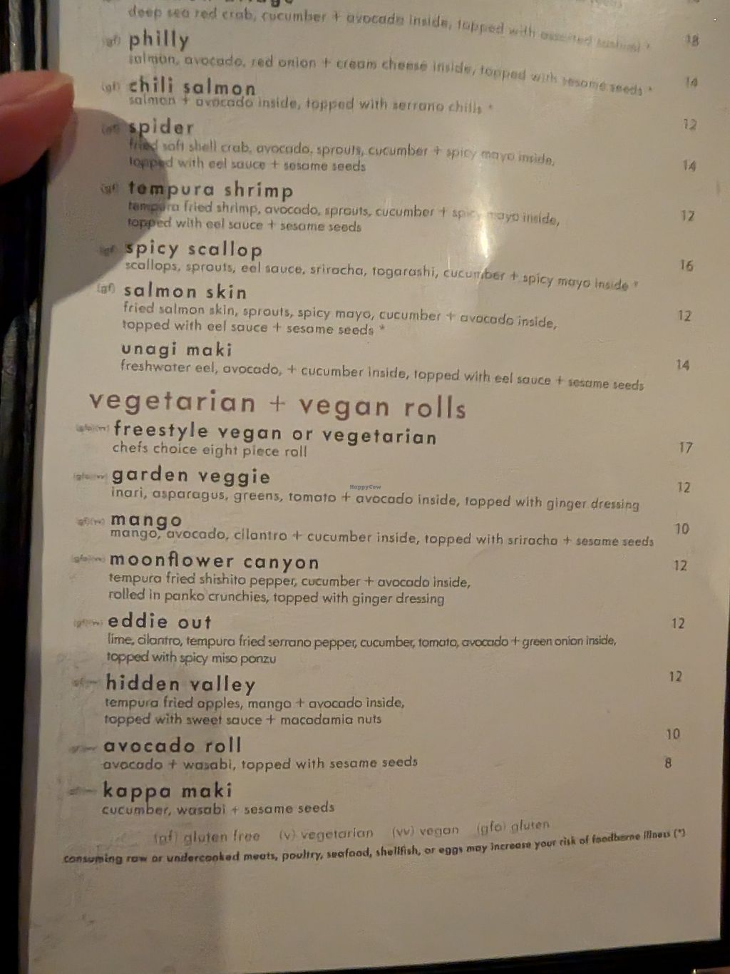 Specialty vegan/vegetarian menu with gluten free option too. We tried all 6 specialty vegan rolls and they were really good! Ate there twice during our 4 days in Moab. Three types of seaweed/sea vegetable salads that we also really liked. Highly recommend for vegans who travel to Moab. Rolls are small though.