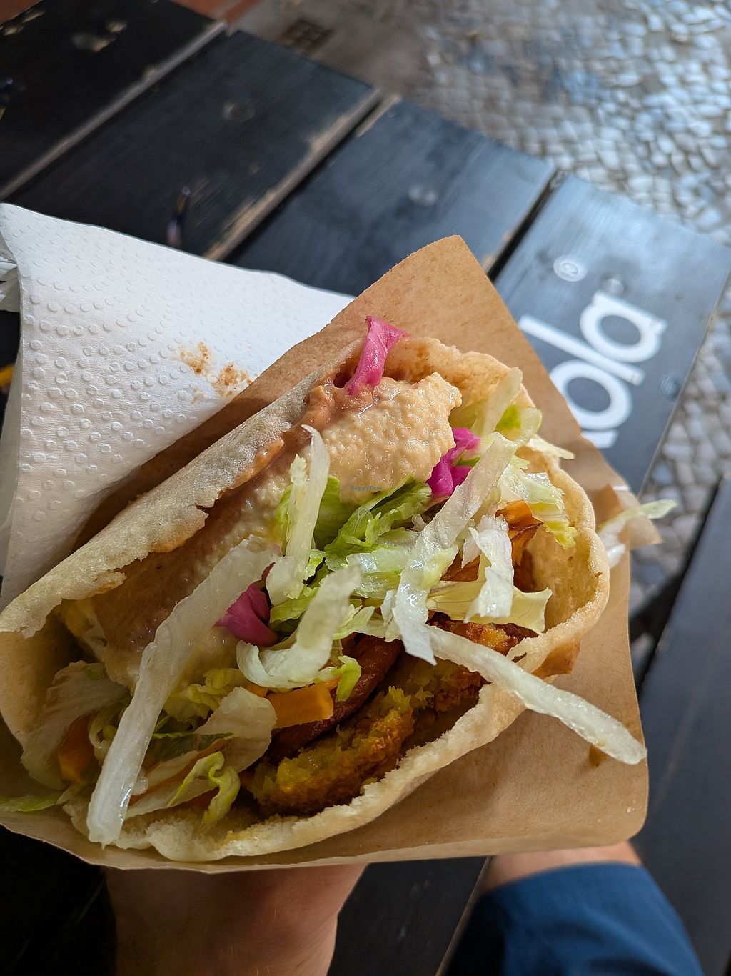 Yummy falafel and magali sandwich with a generous amount of veggies, sauces and nice flavor. Only cash.
