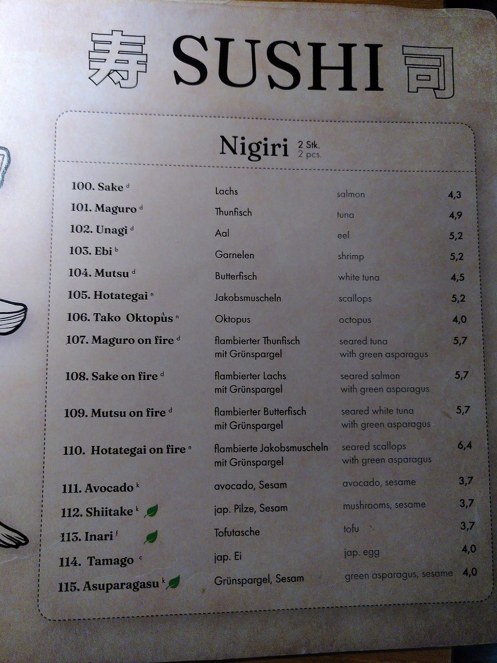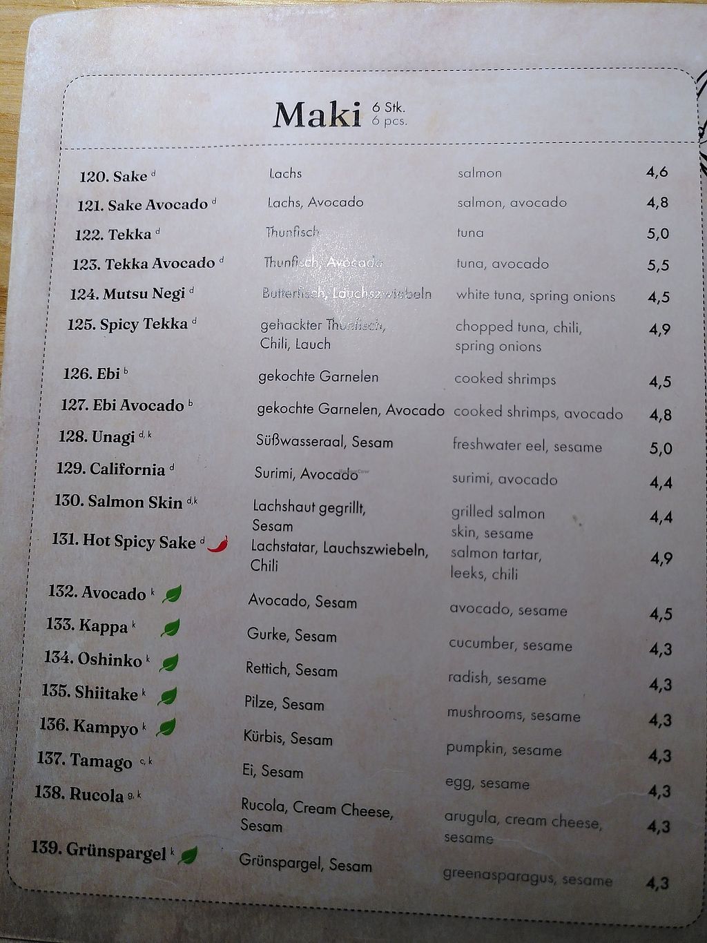 Eine Seite im Menü nur für vegane Gerichte und auch einige Sushi arten sind vegan.