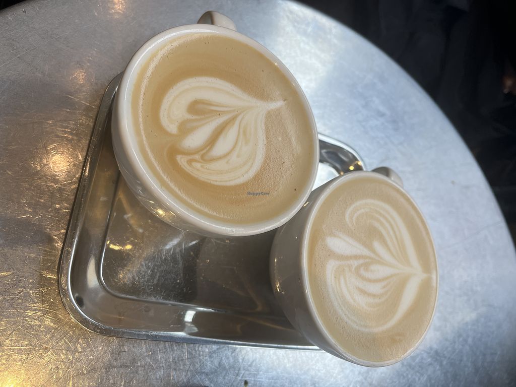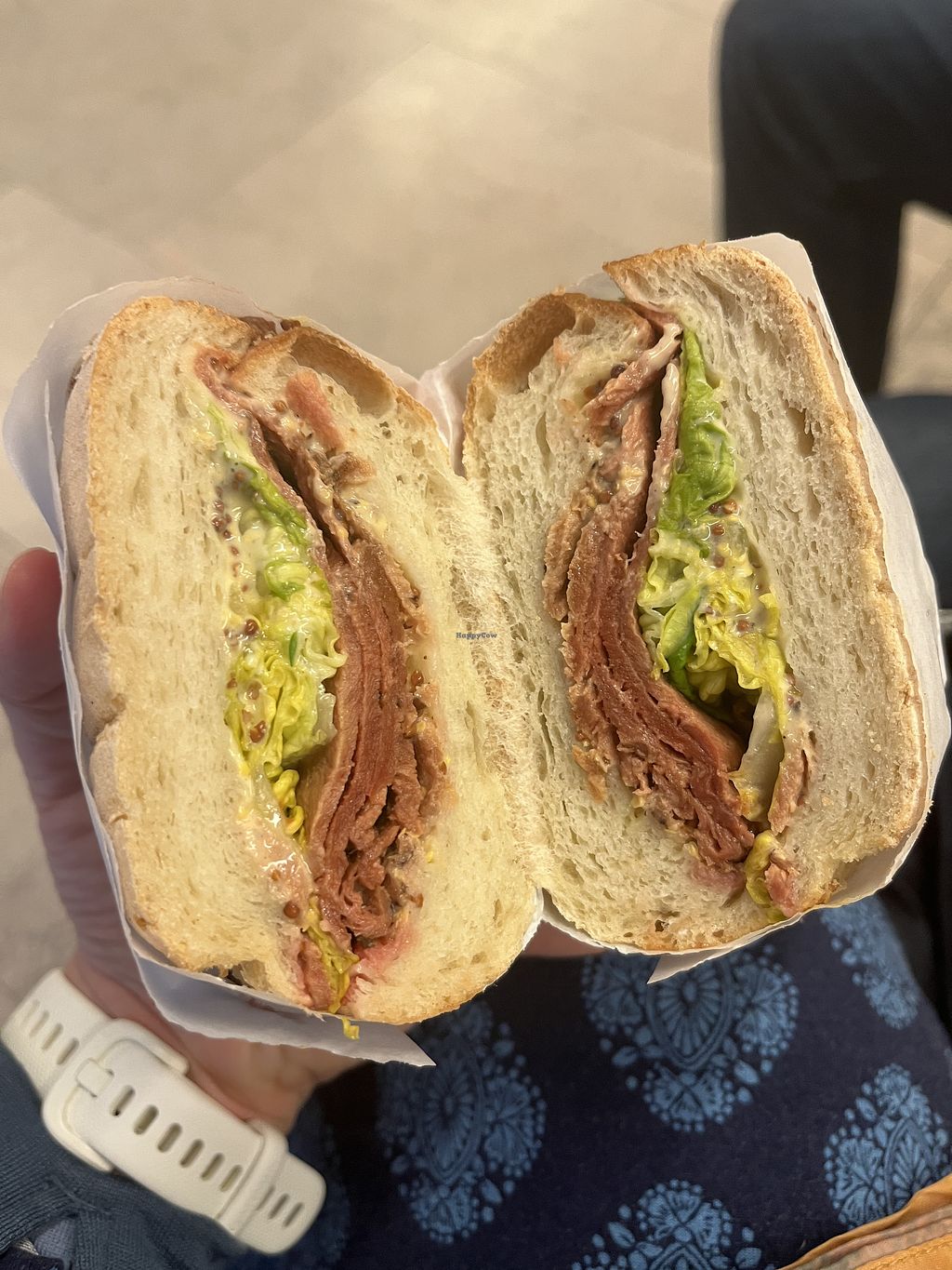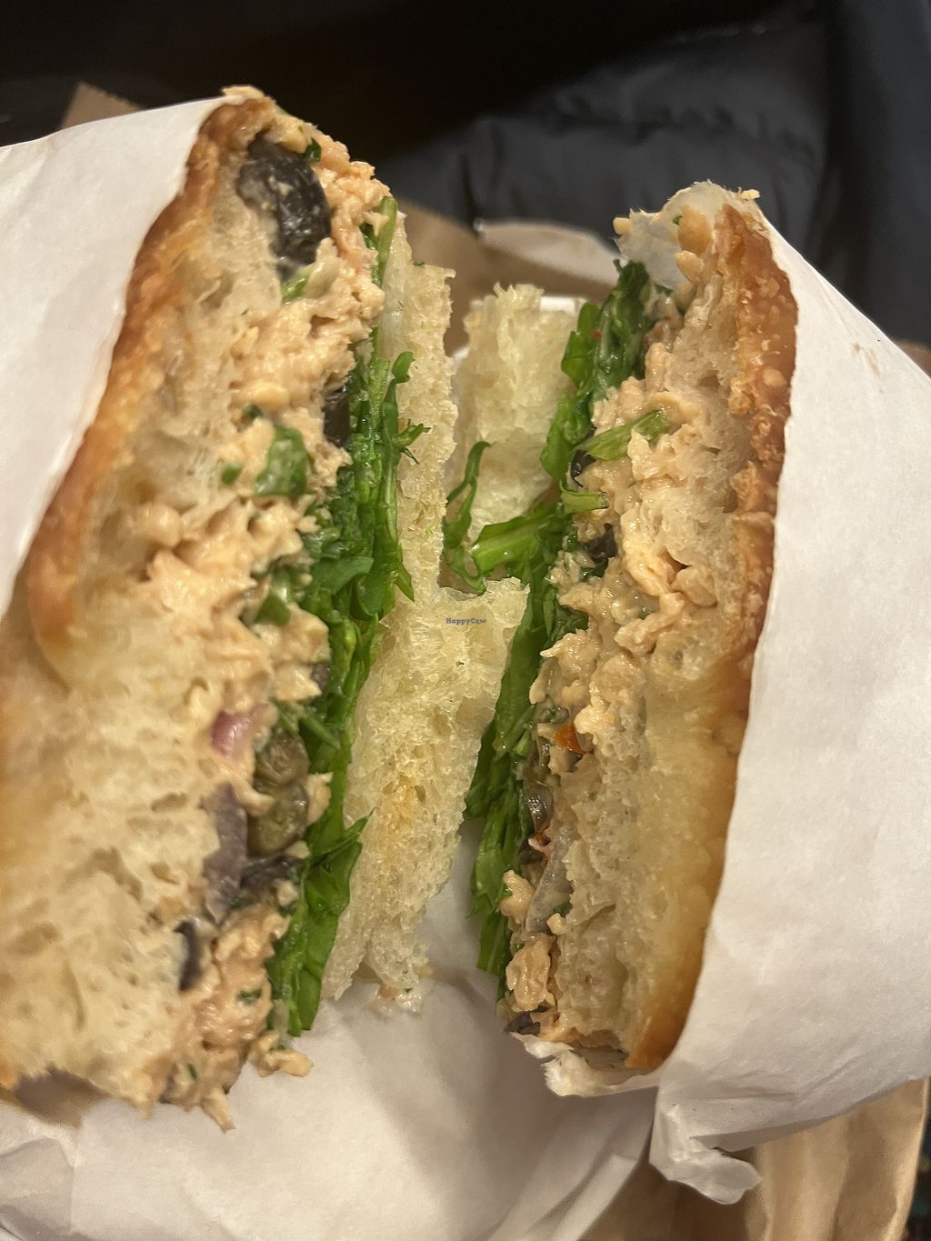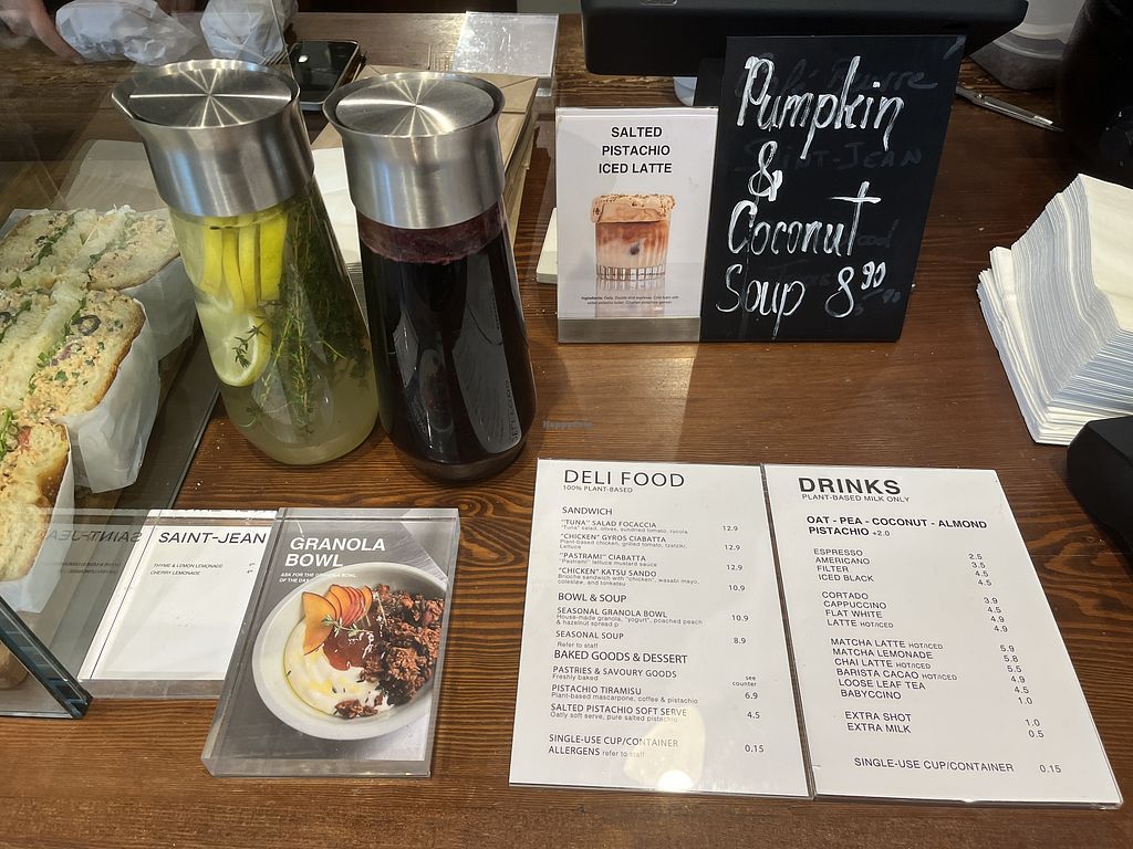 Delightful vegan pastry shop with coffees and pistachio soft serve ice cream. The tuna sandwich was awesome and felt like the real thing. The pastrami with mustard was nice too. Good creamy coffees. It was an operation trying to get a seat so we could enjoy our coffees. They say you need to order first before sitting but then you can’t be sure to get a table. Luckily we managed and brought sweet pastries from their place opposite as well. Yum! I’d love to try everything on the menu.
