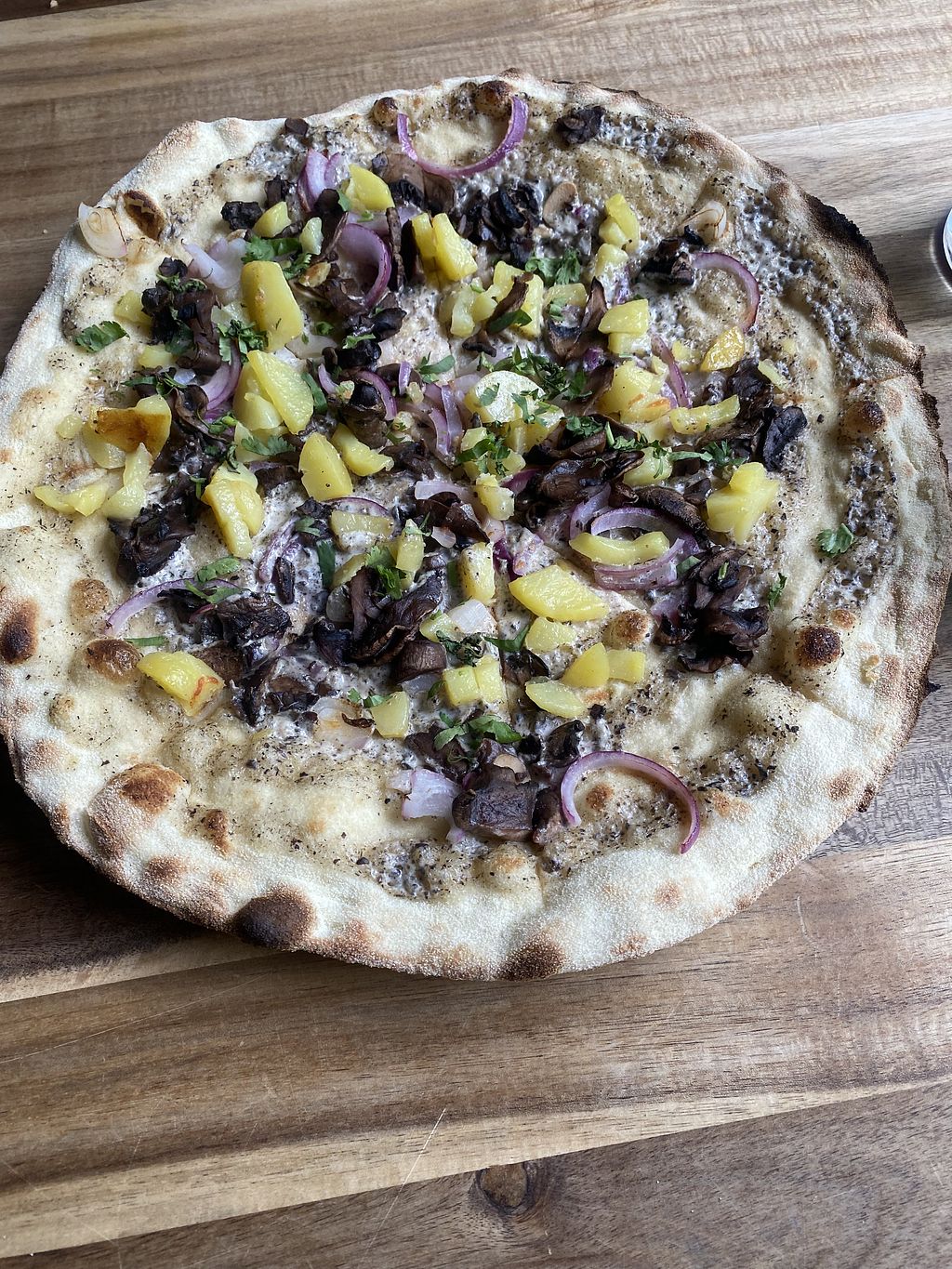 Cozy restaurant/bar next to the park. They serve two vegan bagel/sandwich options and two different types of vegan pizza. We ordered white pizza and it was tasty! Also has oat milk for coffee.
