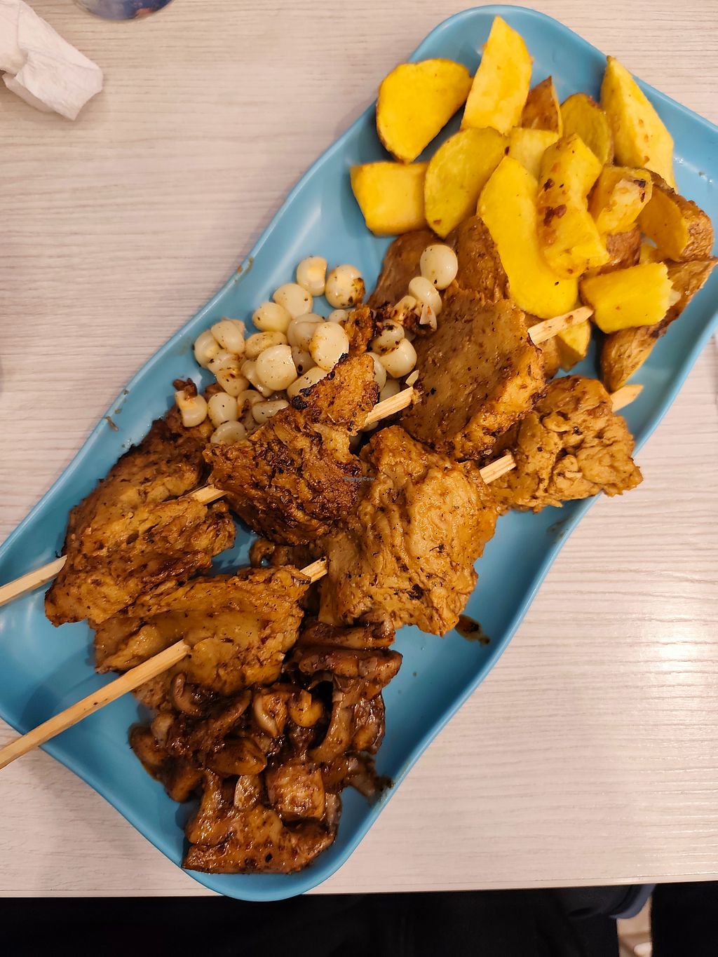 We thought they were only open on the weekend but in walking by saw they were open & we’re so happy we stopped on. There were so many choices but we decided to try a plate to share. It included wings, sausage, mushrooms, avocado, papas & a skewer. Wow, was it tasty! The “meat” on the skewer was so juicy w/a great grilled taste. The employees were very friendly & helpful & the space was welcoming.