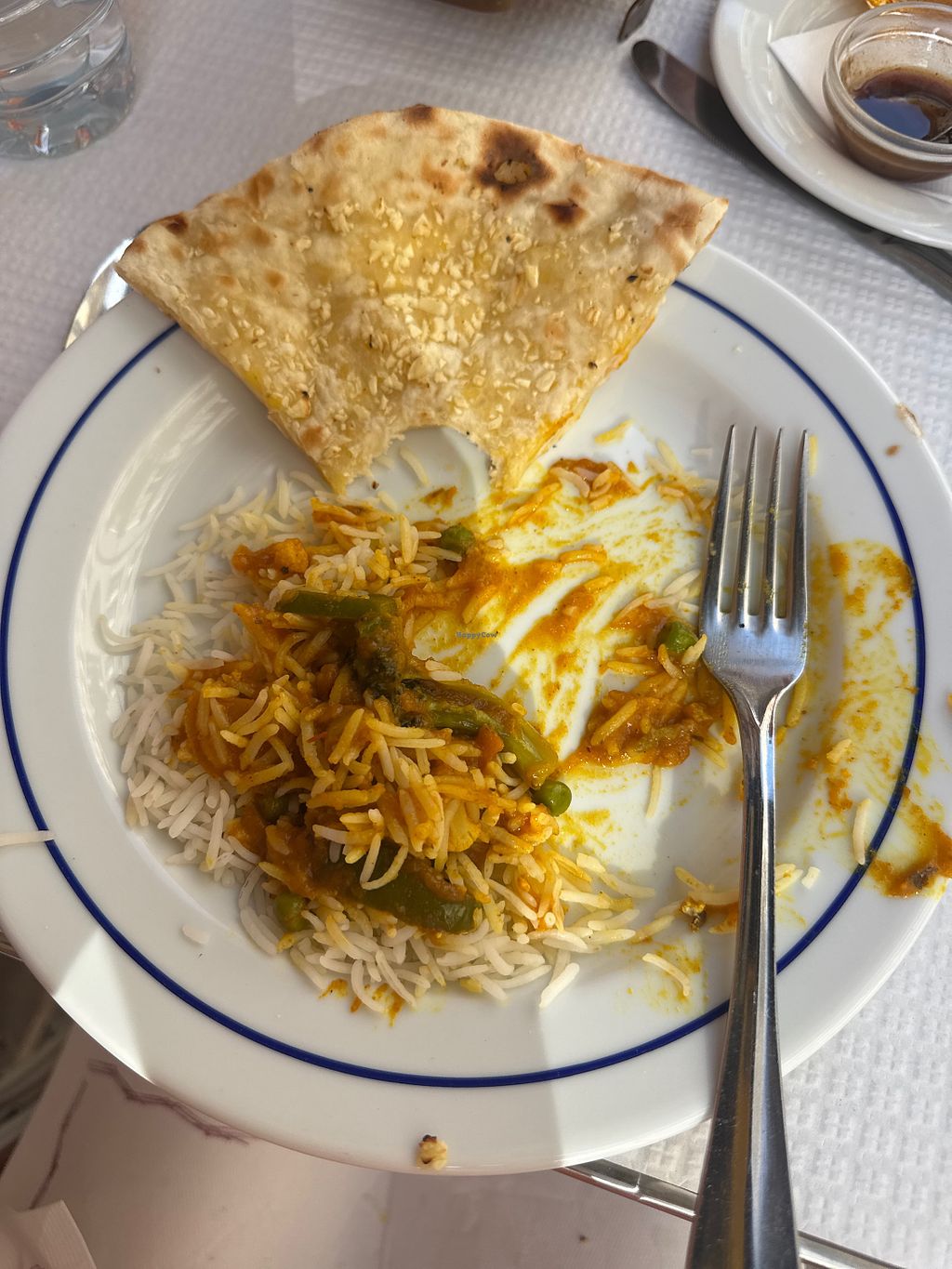 We had vegan chicken masala, garlic naan, pashwari naan with naaza rice (cumin). I’d recommend all of these.