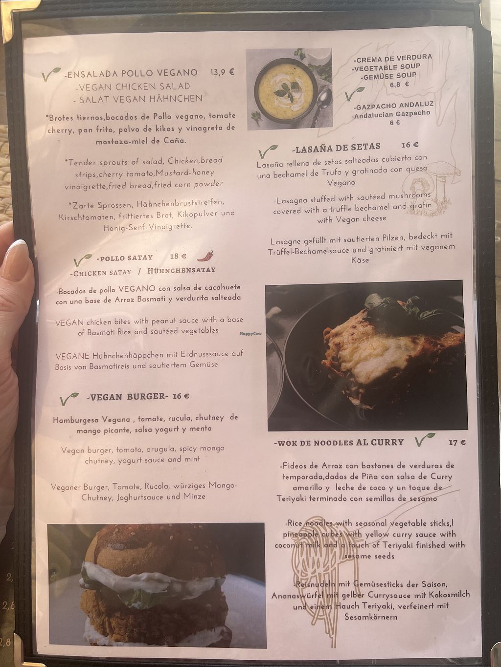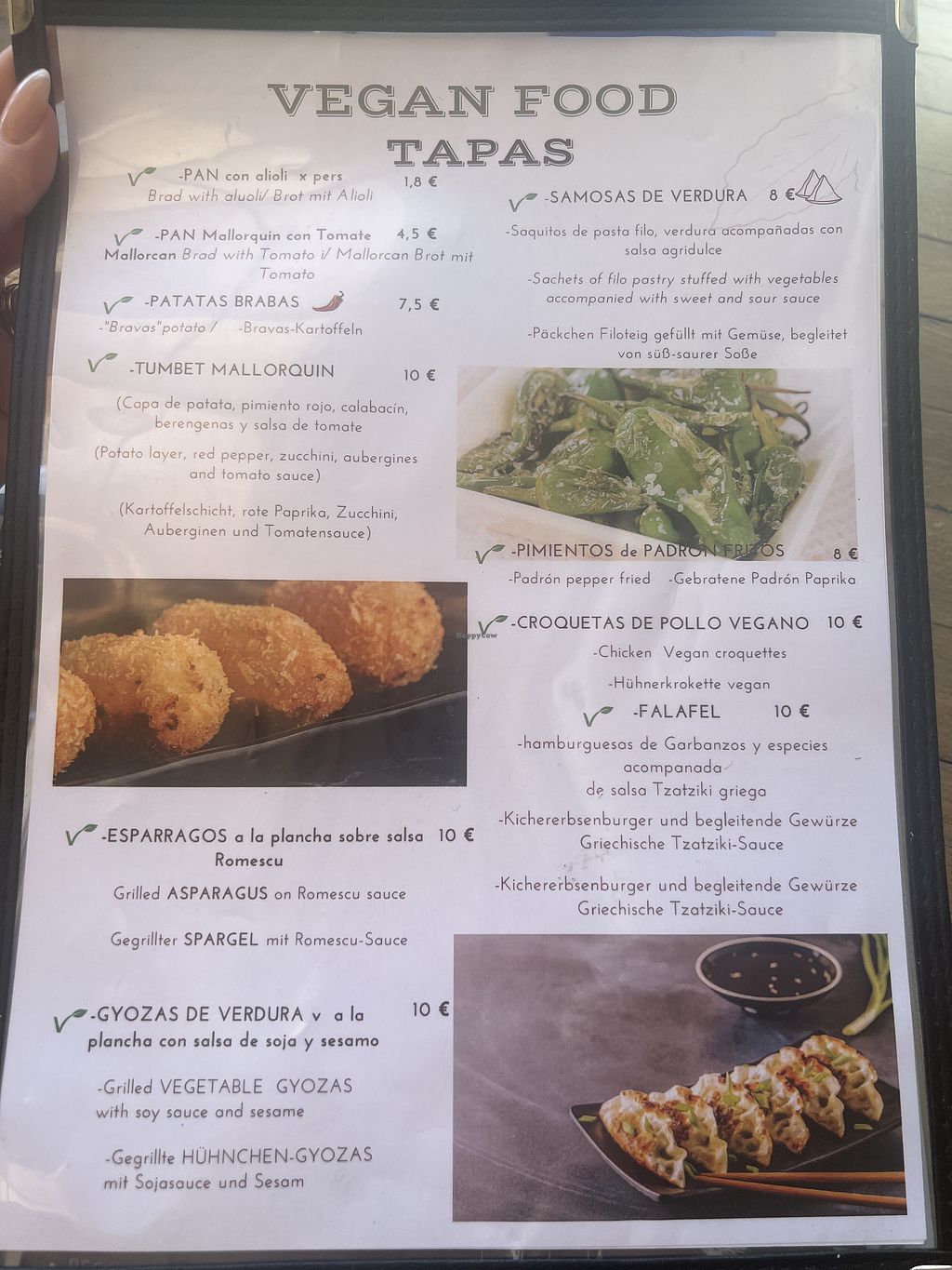 We were initially disappointed to think the restaurant was closed - however it appears to be set across two units with one side locked and shuttered. The menu was great - plenty of clearly marked vegan options including several tapas dishes. We had the vegan chicken croquettes, patatas bravas, pan con tomate, and timbet mallorcan - everything was delicious! There were plenty more options - unfortunately stomach capacity meant I couldn’t try them all. We visited on our last day otherwise I would have made a few trips to sample everything.