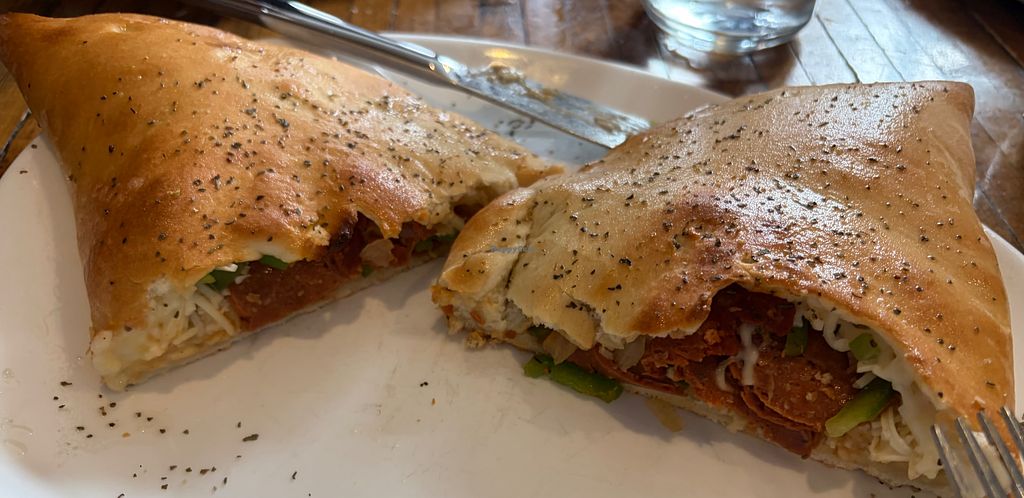 Sauce on the side was always okay for vegans. They didn't have vegan cheese, but had plenty of veggies and the marinara and dough for their calzones is vegan. But now they offer the Skinny V calzone with Vegan Pepperoni / Vegan Meatballs / Vegan Cheese / White Onion / Green Peppers / Roasted Garlic / Served with Spicy Red Sauce. It's good! I think next time I'll skip the peppers and add some olives and mushrooms, but so happy to have this fully vegan option.