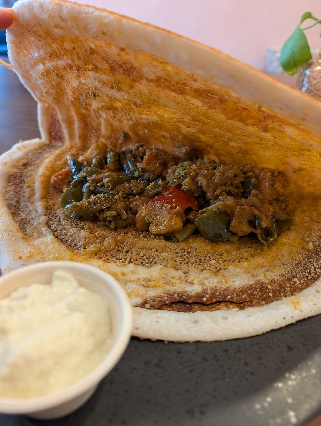 Everything was delicious and super satisfying. Got the pakora, dosa with seasonal veggies, and cheese steak. Everything was spiced perfectly, can't wait to try more!