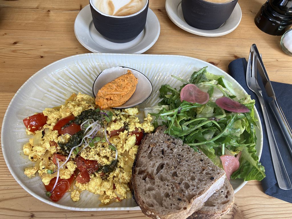 They have good breakfast options, it's one of the few cafes in Mainz where you can have scrambled tofu eggs for breakfast. The scrambled eggs are well-seasoned and served with some coleslaw and cucumber, a tasty bun and vegan tomato butter. They have vegan cake, too, the cinnamon buns are yummy. The staff is nice. There's a small outside sitting area. Will definitely go there again. It's a bit pricey, but I think it's worth it.
