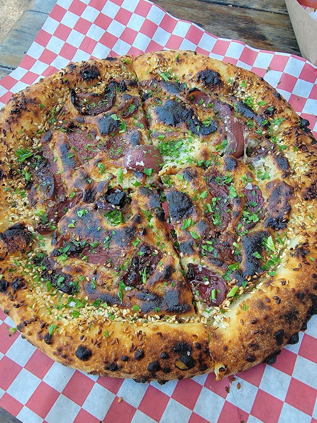 They can pretty much veganize most pies and some appetizers. They have a house made cheese they use. The knots were good, but not great. The Frankie P. was very delicious. Took about 30 mins for the food. Only one inside table and 3 little benches outside, so not many places to sit. Everyone inside was very friendly and helpful. I'd definitely go again and try some other pies.